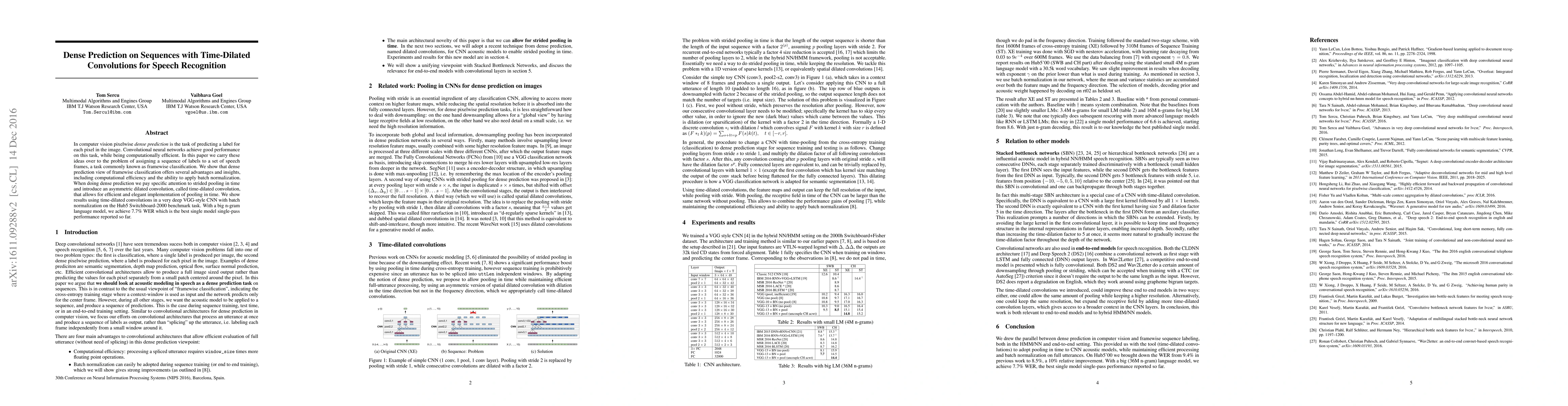 This paper proposes a dense prediction approach using time-dilated convolutions for speech recognition, achieving computational efficiency and improved performance. It demonstrates superior results on the Hub5 Switchboard-2000 benchmark, reporting a 7.7% WER, the best single-pass performance to date.