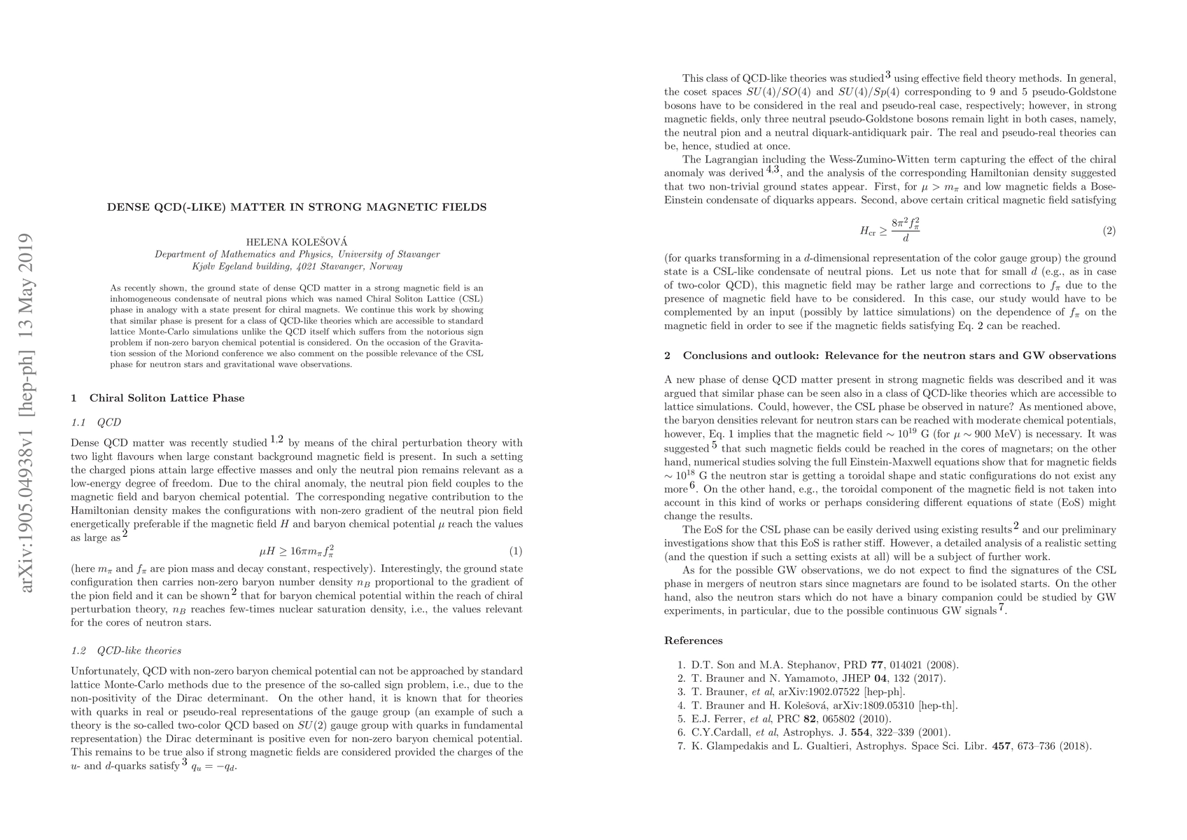 As recently shown, the ground state of dense QCD matter in a strong magnetic field is an inhomogeneous condensate of neutral pions which was named Chiral Soliton Lattice (CSL) phase in analogy with a state present for chiral magnets. We continue this work by showing that similar phase is present for a class of QCD-like theories which are accessible to standard lattice Monte-Carlo simulations unlike the QCD itself which suffers from the notorious sign problem if non-zero baryon chemical potential is considered. On the occasion of the Gravitation session of the Moriond conference we also briefly comment on the possible relevance of the CSL phase for neutron stars and gravitational wave observations.