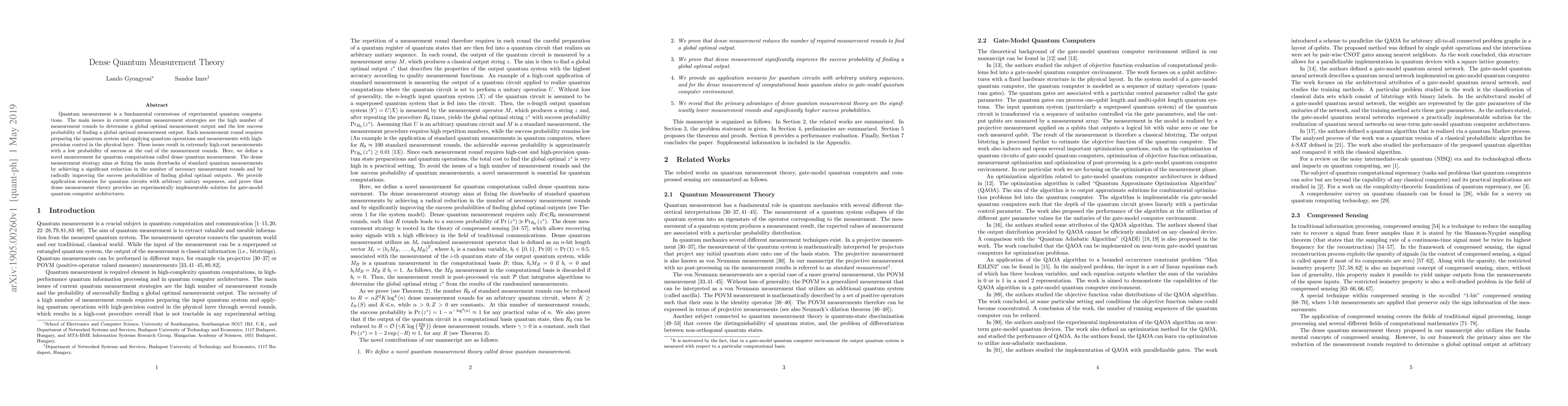 Quantum measurement is a fundamental cornerstone of experimental quantum computations. The main issues in current quantum measurement strategies are the high number of measurement rounds to determine a global optimal measurement output and the low success probability of finding a global optimal measurement output. Each measurement round requires preparing the quantum system and applying quantum operations and measurements with high-precision control in the physical layer. These issues result in extremely high-cost measurements with a low probability of success at the end of the measurement rounds. Here, we define a novel measurement for quantum computations called dense quantum measurement. The dense measurement strategy aims at fixing the main drawbacks of standard quantum measurements by achieving a significant reduction in the number of necessary measurement rounds and by radically improving the success probabilities of finding global optimal outputs. We provide application scenarios for quantum circuits with arbitrary unitary sequences, and prove that dense measurement theory provides an experimentally implementable solution for gate-model quantum computer architectures.