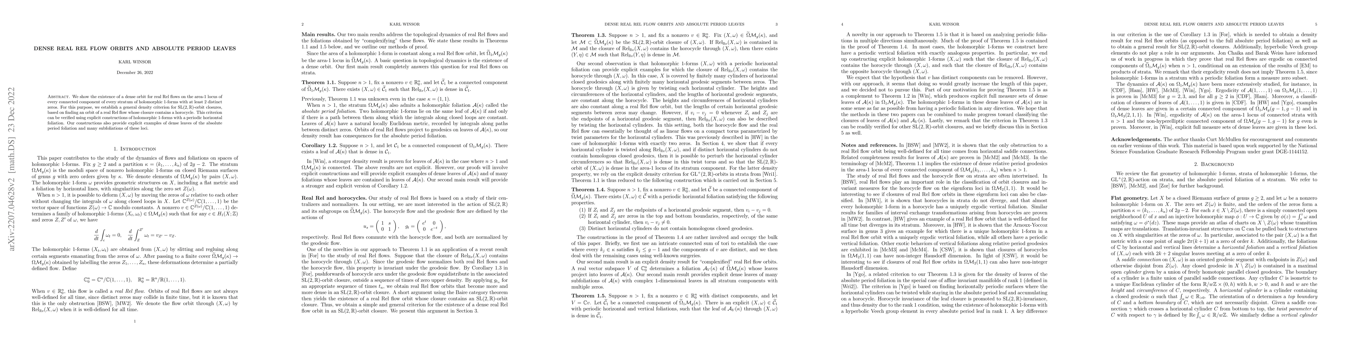 This paper demonstrates the existence of dense orbits for real Rel flows on the area-1 locus within connected components of holomorphic 1-forms with at least two distinct zeros. It establishes a general density criterion for ${\rm SL}(2,\mathbb{R})$-orbit closures, utilizing explicit constructions of such 1-forms and providing examples of dense leaves in the absolute period foliation.