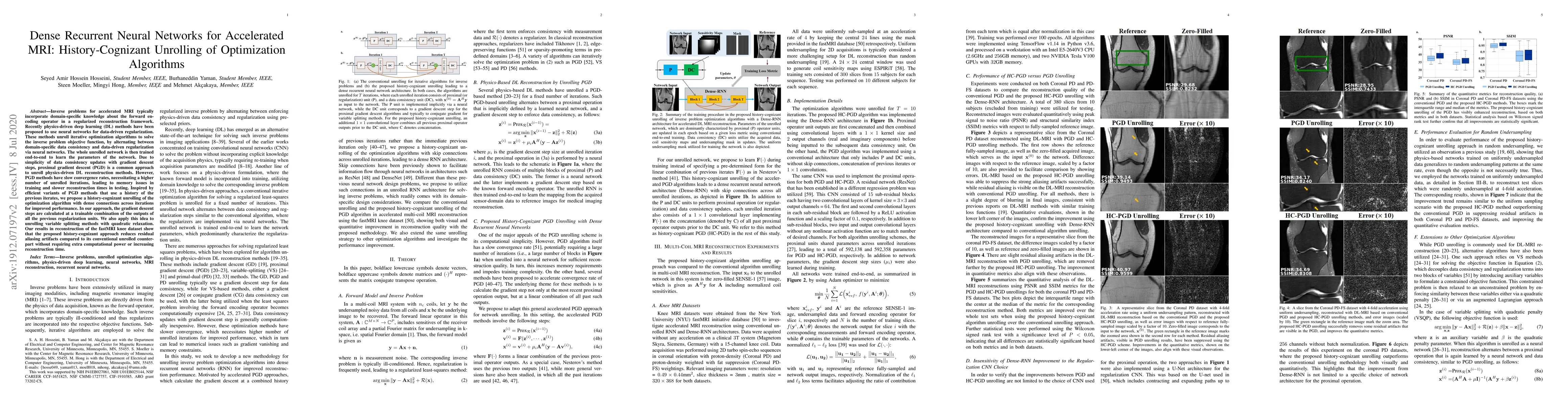 This paper proposes a dense recurrent neural network for accelerated MRI reconstruction that utilizes history-cognizant unrolling of optimization algorithms to improve convergence rates and reduce residual aliasing artifacts. The approach combines previous iterates in gradient descent steps, leading to faster training and faster reconstruction without extra computational costs.