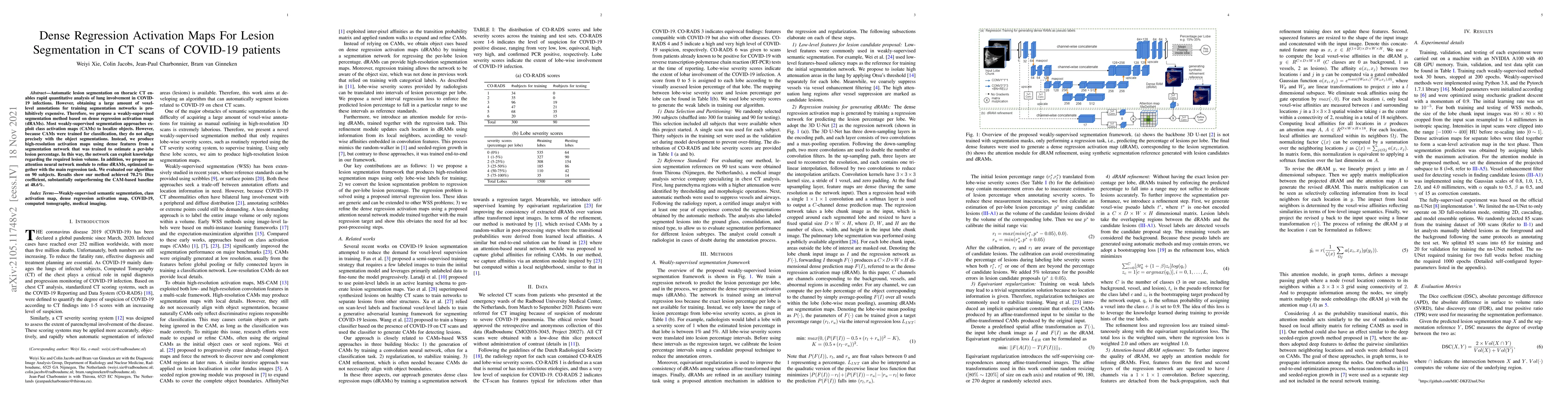 This paper proposes a weakly-supervised segmentation method using dense regression activation maps (dRAMs) for segmenting lesions in COVID-19 CT scans, achieving a 70.2% Dice coefficient, significantly better than the 48.6% of a class activation map (CAM)-based baseline. The method leverages dense features from a segmentation network trained to estimate lesion volume per lobe.