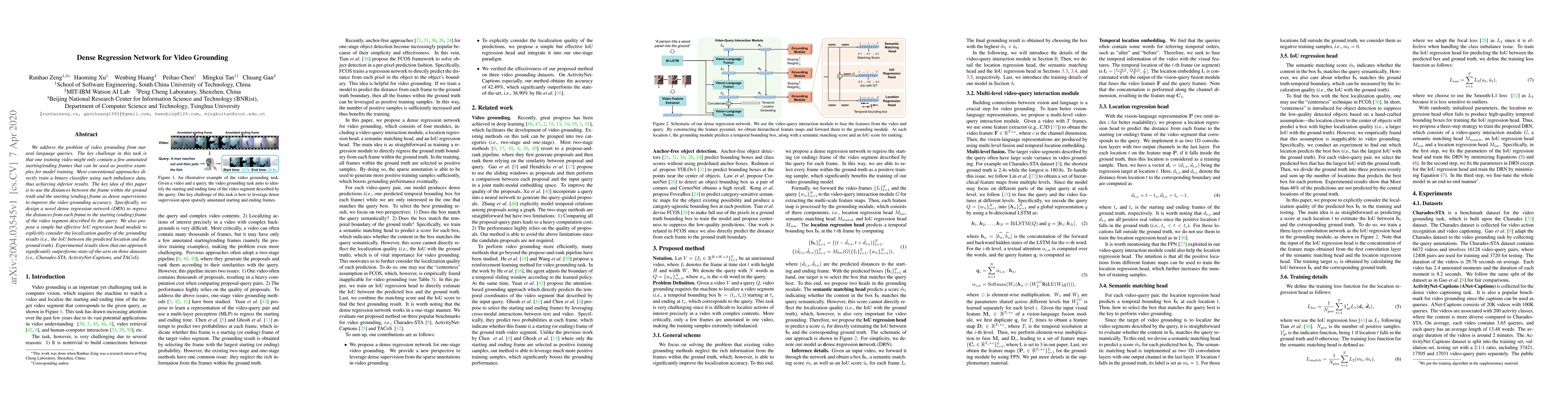 This paper proposes a dense regression network (DRN) to improve video grounding accuracy by using distances between frames and the starting/ending frames as dense supervisions. The approach includes an IoU regression head for localization quality, outperforming state-of-the-art methods on three datasets.