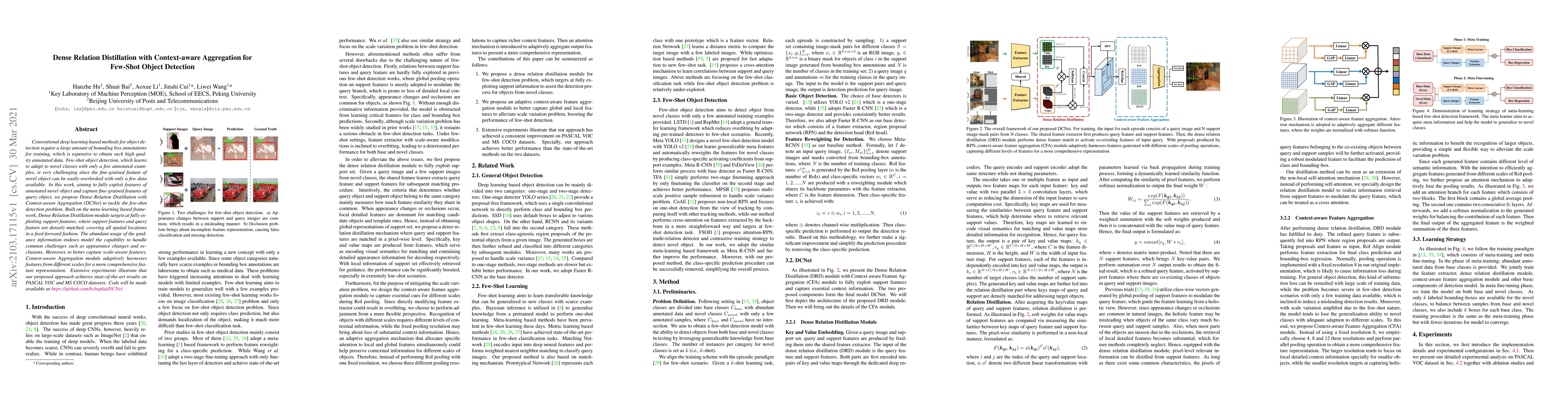 This paper proposes Dense Relation Distillation with Context-aware Aggregation (DCNet) for few-shot object detection, leveraging meta-learning to exploit support features and adaptively aggregate context-aware features to capture fine-grained details, achieving state-of-the-art results on PASCAL VOC and MS COCO datasets.