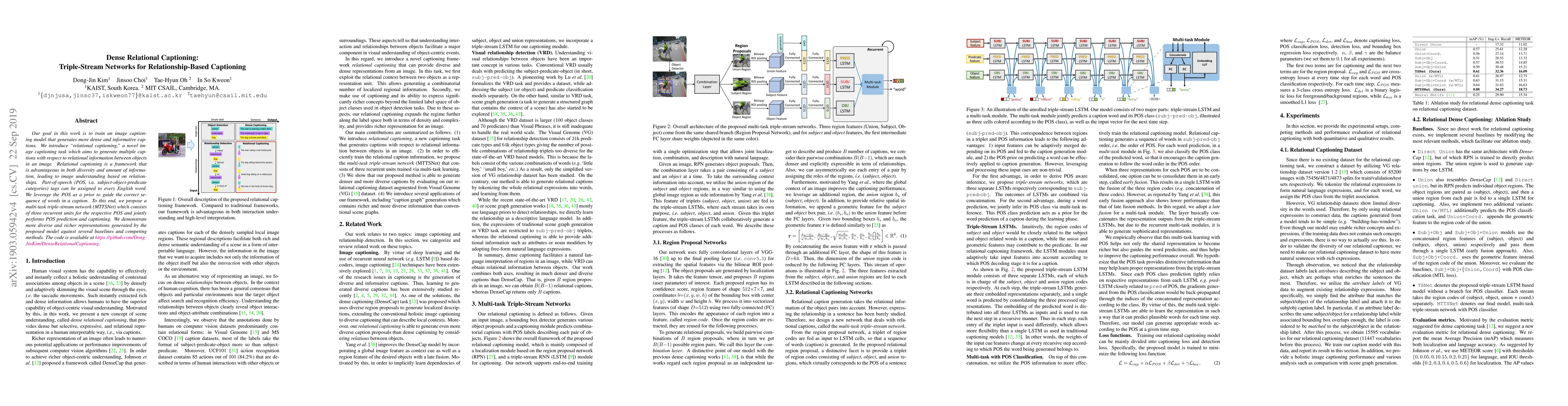 This paper proposes a novel "relational captioning" framework to generate dense and informative image captions by focusing on relationships between objects. The authors introduce a multi-task triple-stream network (MTTSNet) that leverages part-of-speech tags to enhance caption diversity and information richness, outperforming existing baselines.