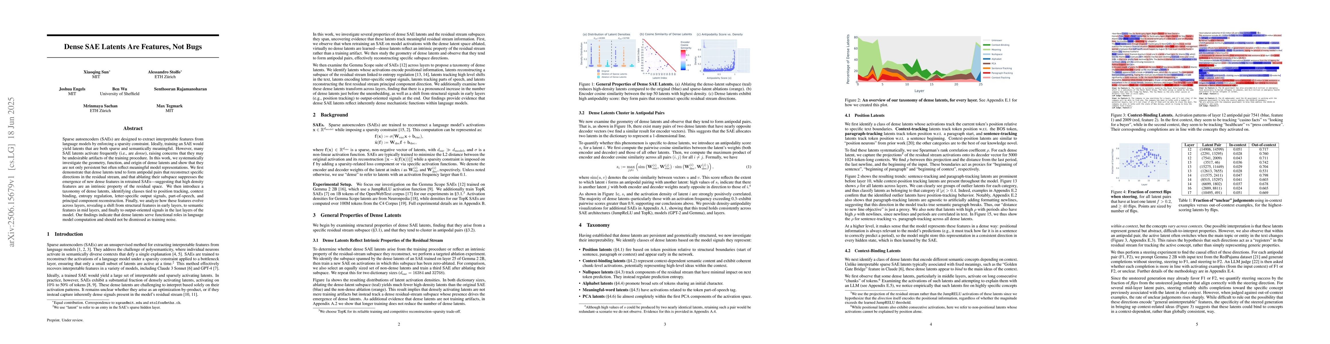 Sparse autoencoders (SAEs) are designed to extract interpretable features from language models by enforcing a sparsity constraint. Ideally, training an SAE would yield latents that are both sparse and semantically meaningful. However, many SAE latents activate frequently (i.e., are \emph{dense}), raising concerns that they may be undesirable artifacts of the training procedure. In this work, we systematically investigate the geometry, function, and origin of dense latents and show that they are not only persistent but often reflect meaningful model representations. We first demonstrate that dense latents tend to form antipodal pairs that reconstruct specific directions in the residual stream, and that ablating their subspace suppresses the emergence of new dense features in retrained SAEs -- suggesting that high density features are an intrinsic property of the residual space. We then introduce a taxonomy of dense latents, identifying classes tied to position tracking, context binding, entropy regulation, letter-specific output signals, part-of-speech, and principal component reconstruction. Finally, we analyze how these features evolve across layers, revealing a shift from structural features in early layers, to semantic features in mid layers, and finally to output-oriented signals in the last layers of the model. Our findings indicate that dense latents serve functional roles in language model computation and should not be dismissed as training noise.