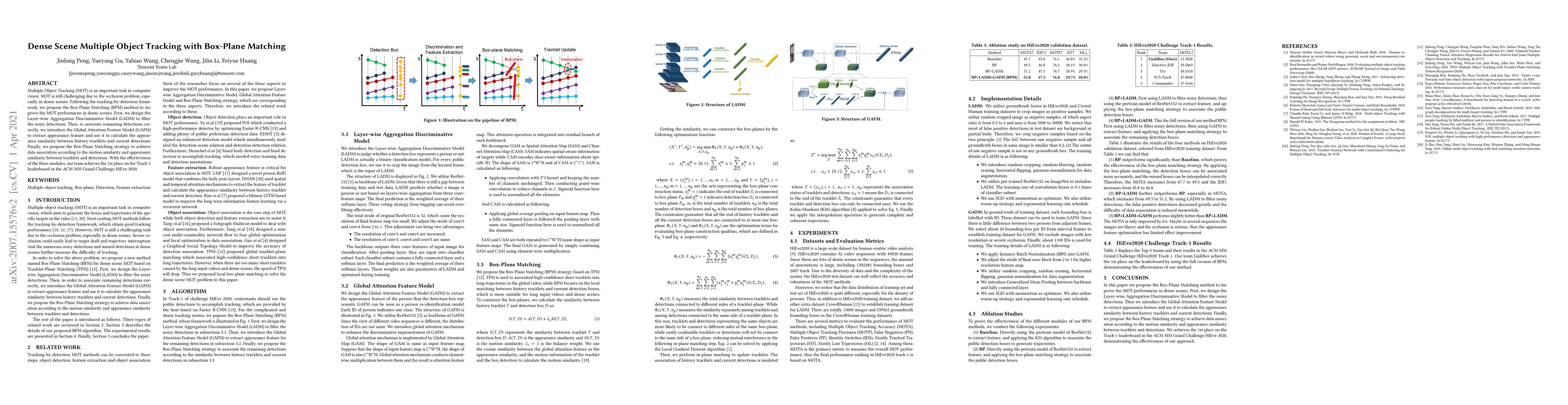 Multiple Object Tracking (MOT) is an important task in computer vision. MOT is still challenging due to the occlusion problem, especially in dense scenes. Following the tracking-by-detection framework, we propose the Box-Plane Matching (BPM) method to improve the MOT performacne in dense scenes. First, we design the Layer-wise Aggregation Discriminative Model (LADM) to filter the noisy detections. Then, to associate remaining detections correctly, we introduce the Global Attention Feature Model (GAFM) to extract appearance feature and use it to calculate the appearance similarity between history tracklets and current detections. Finally, we propose the Box-Plane Matching strategy to achieve data association according to the motion similarity and appearance similarity between tracklets and detections. With the effectiveness of the three modules, our team achieves the 1st place on the Track-1 leaderboard in the ACM MM Grand Challenge HiEve 2020.