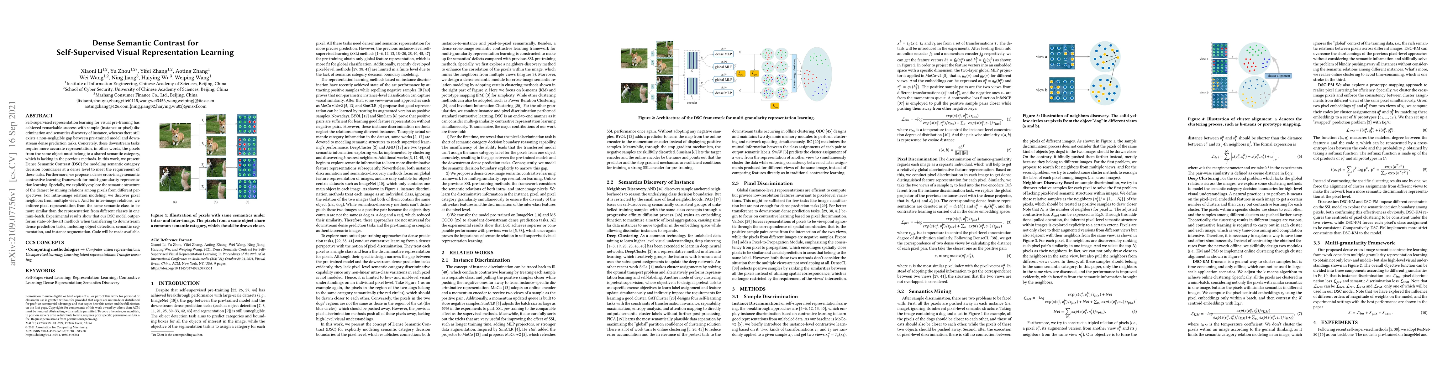This paper introduces Dense Semantic Contrast (DSC) to improve self-supervised visual representation learning for dense prediction tasks by modeling semantic category decision boundaries at a dense level. The proposed framework enhances multi-granularity representation learning through dense cross-image semantic contrastive learning, achieving superior performance in object detection, semantic segmentation, and instance segmentation compared to state-of-the-art methods.