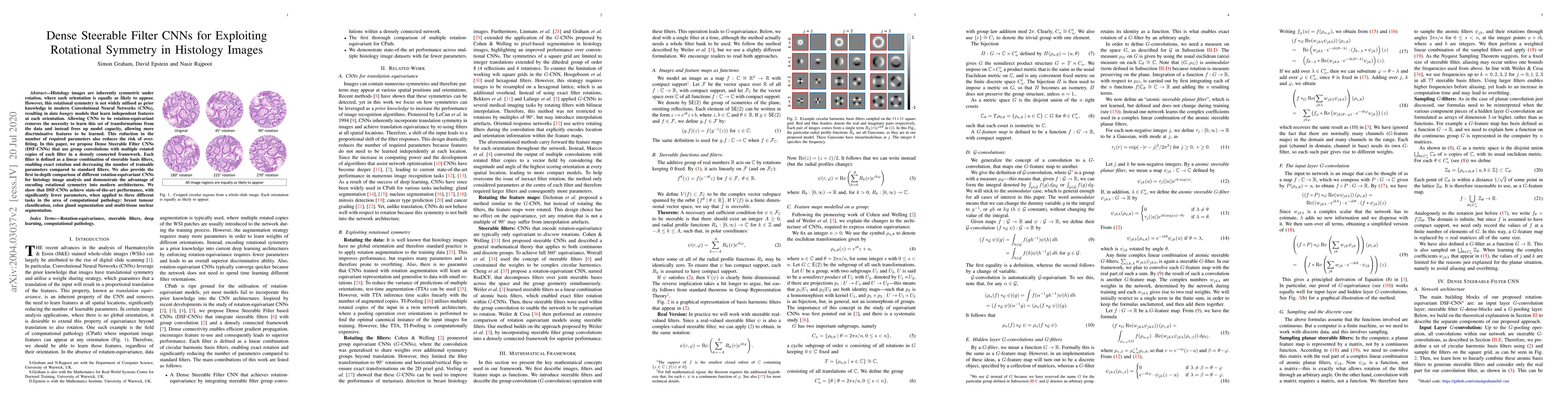 This paper proposes Dense Steerable Filter CNNs (DSF-CNNs) that leverage rotational symmetry in histology images, achieving state-of-the-art performance with fewer parameters by using group convolutions and steerable basis filters. The method demonstrates superior results in breast tumour classification, colon gland segmentation, and multi-tissue nuclear segmentation.