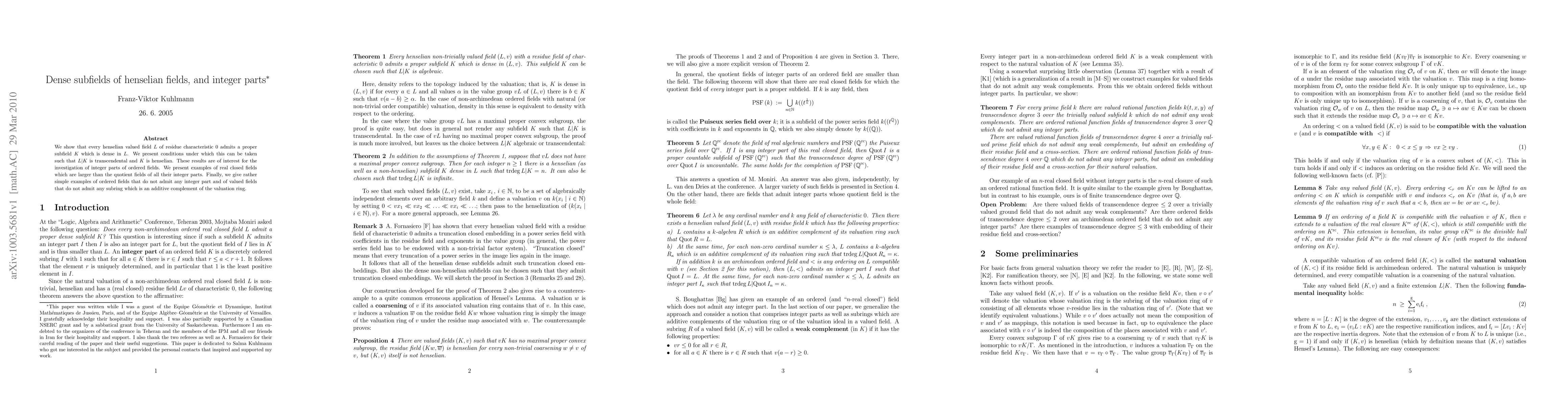 This paper demonstrates that every henselian valued field with residue characteristic 0 contains a dense proper subfield, which can be chosen to be henselian and transcendental over the original field. The study also explores the existence of integer parts in ordered fields, providing examples of real closed fields that exceed the quotient fields of their integer parts.
