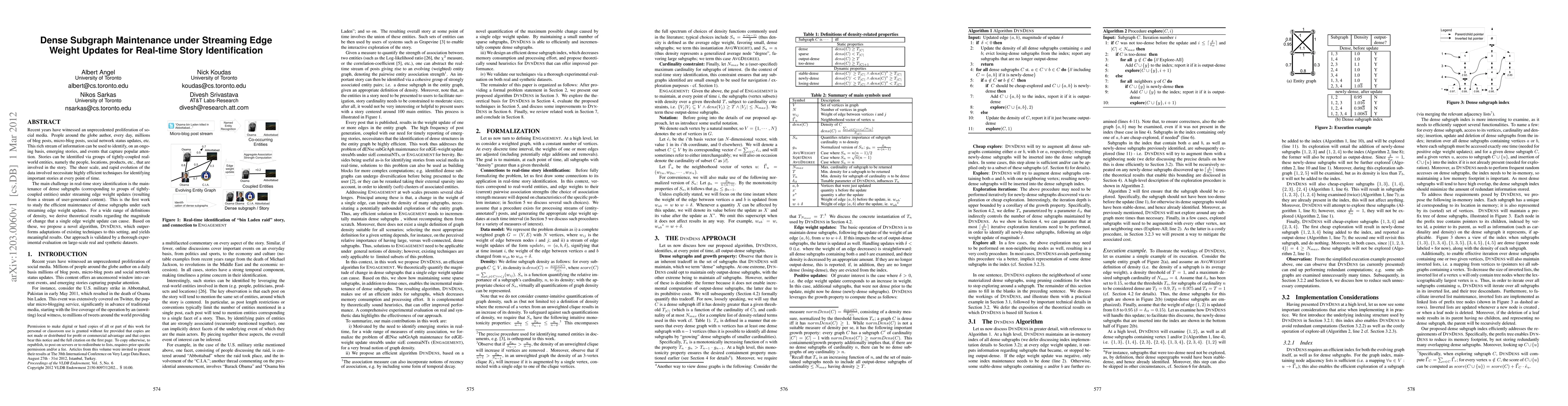 Recent years have witnessed an unprecedented proliferation of social media. People around the globe author, every day, millions of blog posts, social network status updates, etc. This rich stream of information can be used to identify, on an ongoing basis, emerging stories, and events that capture popular attention. Stories can be identified via groups of tightly-coupled real-world entities, namely the people, locations, products, etc., that are involved in the story. The sheer scale, and rapid evolution of the data involved necessitate highly efficient techniques for identifying important stories at every point of time. The main challenge in real-time story identification is the maintenance of dense subgraphs (corresponding to groups of tightly-coupled entities) under streaming edge weight updates (resulting from a stream of user-generated content). This is the first work to study the efficient maintenance of dense subgraphs under such streaming edge weight updates. For a wide range of definitions of density, we derive theoretical results regarding the magnitude of change that a single edge weight update can cause. Based on these, we propose a novel algorithm, DYNDENS, which outperforms adaptations of existing techniques to this setting, and yields meaningful results. Our approach is validated by a thorough experimental evaluation on large-scale real and synthetic datasets.
