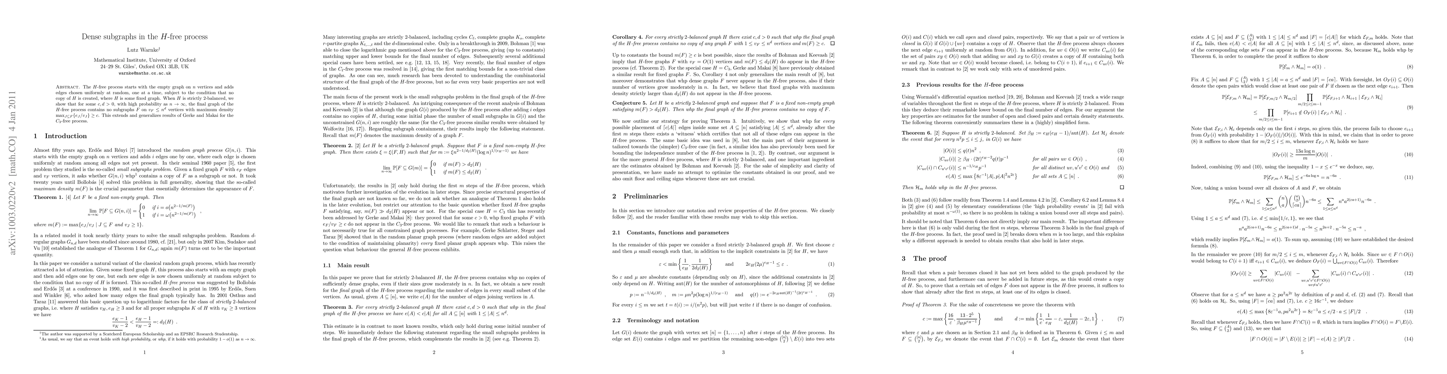 Researchers study a graph generation process where edges are added randomly without creating a fixed graph H, finding that certain subgraphs of large vertices have low maximum density with high probability as the number of vertices increases.