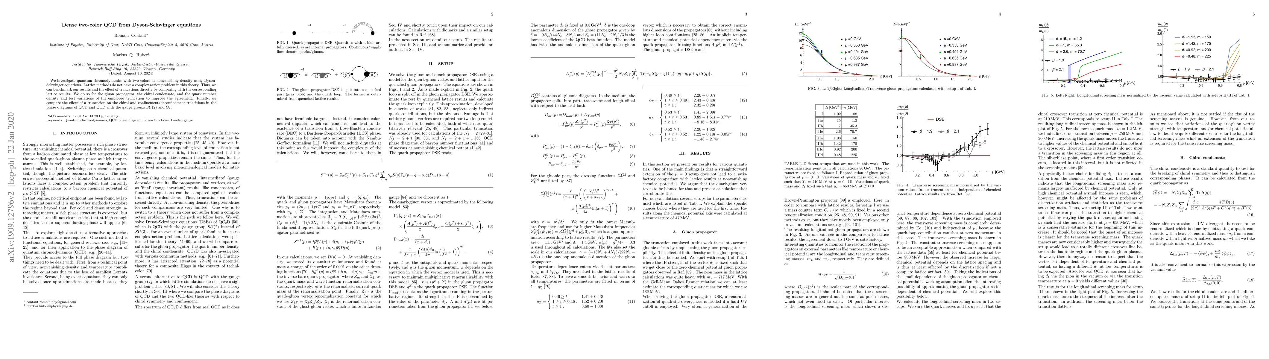This paper uses Dyson-Schwinger equations to study two-color quantum chromodynamics at non-zero density, comparing results with lattice methods to benchmark the approach and test various truncations. The study examines the gluon propagator, chiral condensate, and quark number density, and analyzes the impact of truncations on phase transitions in QCD and related gauge groups.