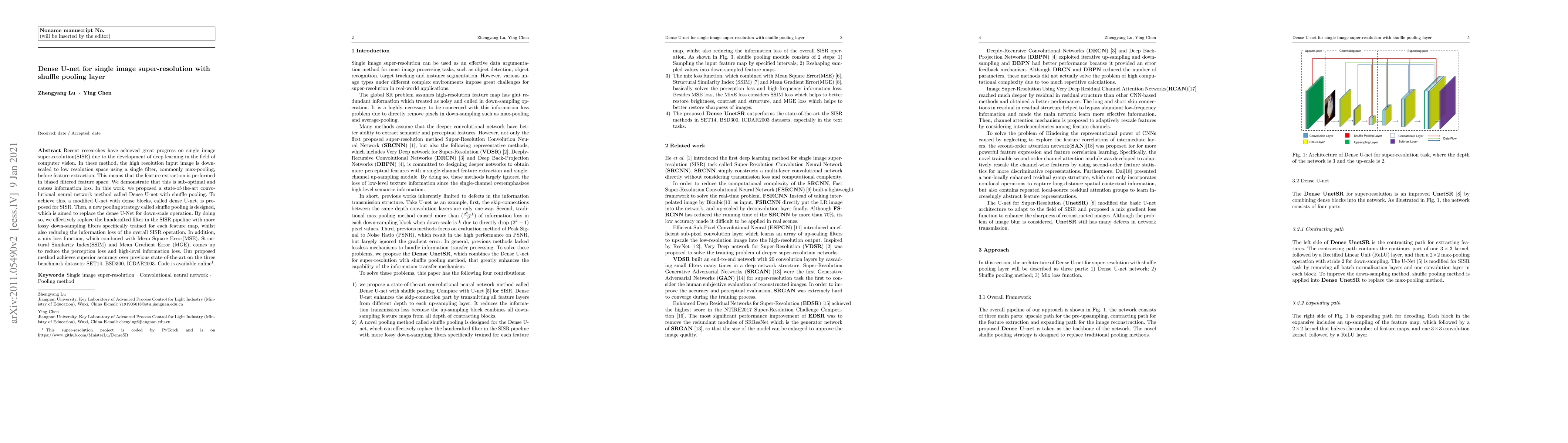 This paper proposes a Dense U-net with a novel shuffle pooling layer for super-resolution, aiming to replace biased max-pooling and reduce information loss. The method uses a mix loss function combining MSE, SSIM, and MGE to enhance accuracy, achieving superior results on benchmark datasets.