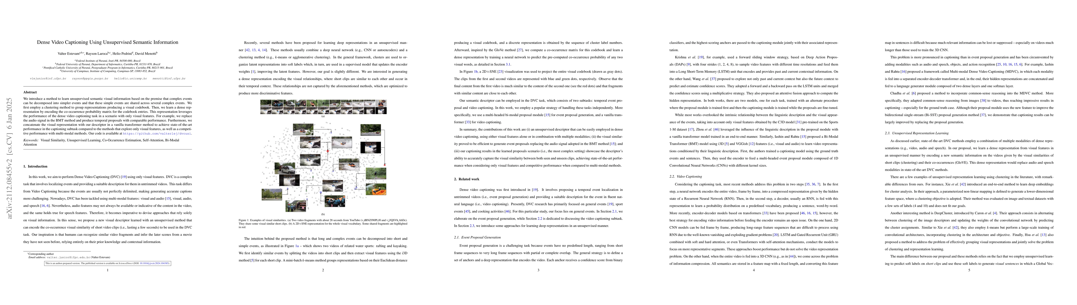 We introduce a method to learn unsupervised semantic visual information based on the premise that complex events (e.g., minutes) can be decomposed into simpler events (e.g., a few seconds), and that these simple events are shared across several complex events. We split a long video into short frame sequences to extract their latent representation with three-dimensional convolutional neural networks. A clustering method is used to group representations producing a visual codebook (i.e., a long video is represented by a sequence of integers given by the cluster labels). A dense representation is learned by encoding the co-occurrence probability matrix for the codebook entries. We demonstrate how this representation can leverage the performance of the dense video captioning task in a scenario with only visual features. As a result of this approach, we are able to replace the audio signal in the Bi-Modal Transformer (BMT) method and produce temporal proposals with comparable performance. Furthermore, we concatenate the visual signal with our descriptor in a vanilla transformer method to achieve state-of-the-art performance in captioning compared to the methods that explore only visual features, as well as a competitive performance with multi-modal methods. Our code is available at https://github.com/valterlej/dvcusi.
