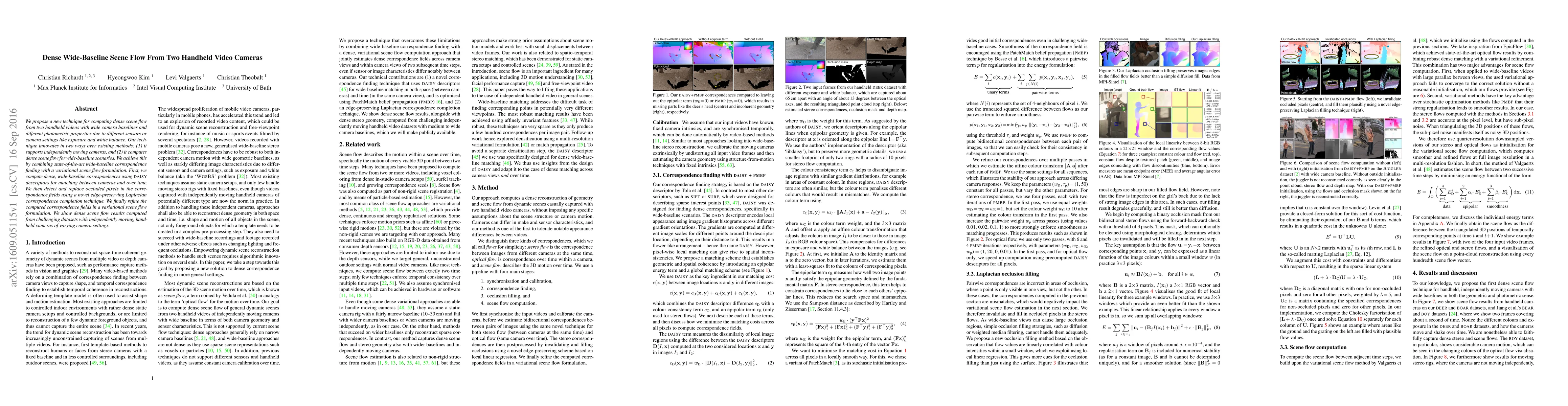 We propose a new technique for computing dense scene flow from two handheld videos with wide camera baselines and different photometric properties due to different sensors or camera settings like exposure and white balance. Our technique innovates in two ways over existing methods: (1) it supports independently moving cameras, and (2) it computes dense scene flow for wide-baseline scenarios.We achieve this by combining state-of-the-art wide-baseline correspondence finding with a variational scene flow formulation. First, we compute dense, wide-baseline correspondences using DAISY descriptors for matching between cameras and over time. We then detect and replace occluded pixels in the correspondence fields using a novel edge-preserving Laplacian correspondence completion technique. We finally refine the computed correspondence fields in a variational scene flow formulation. We show dense scene flow results computed from challenging datasets with independently moving, handheld cameras of varying camera settings.