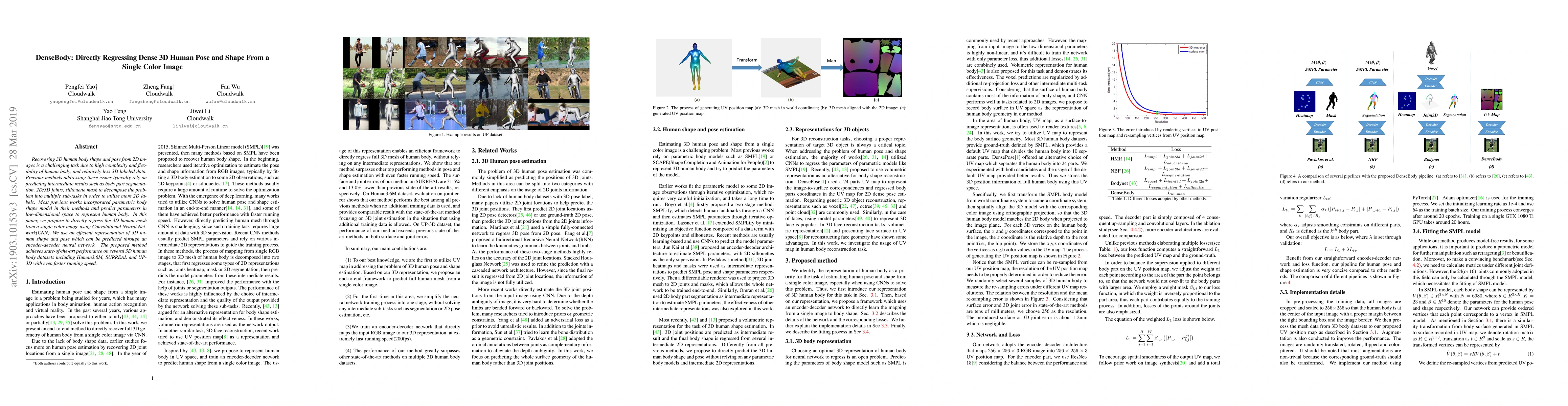 This paper presents a method to directly regress dense 3D human pose and shape from a single color image using a Convolutional Neural Network (CNN). The proposed approach achieves state-of-the-art performance on multiple 3D human datasets by directly predicting the 3D human mesh without relying on intermediate segmentation or joint predictions.