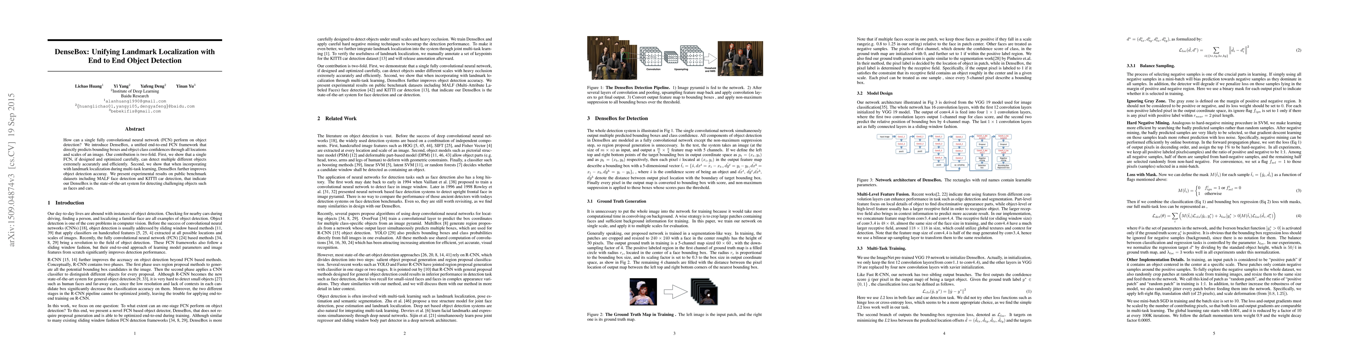 DenseBox is an end-to-end fully convolutional neural network framework that accurately and efficiently detects multiple objects and scales in an image. When combined with landmark localization, it further enhances detection accuracy, achieving state-of-the-art results on benchmark datasets for face and car detection.