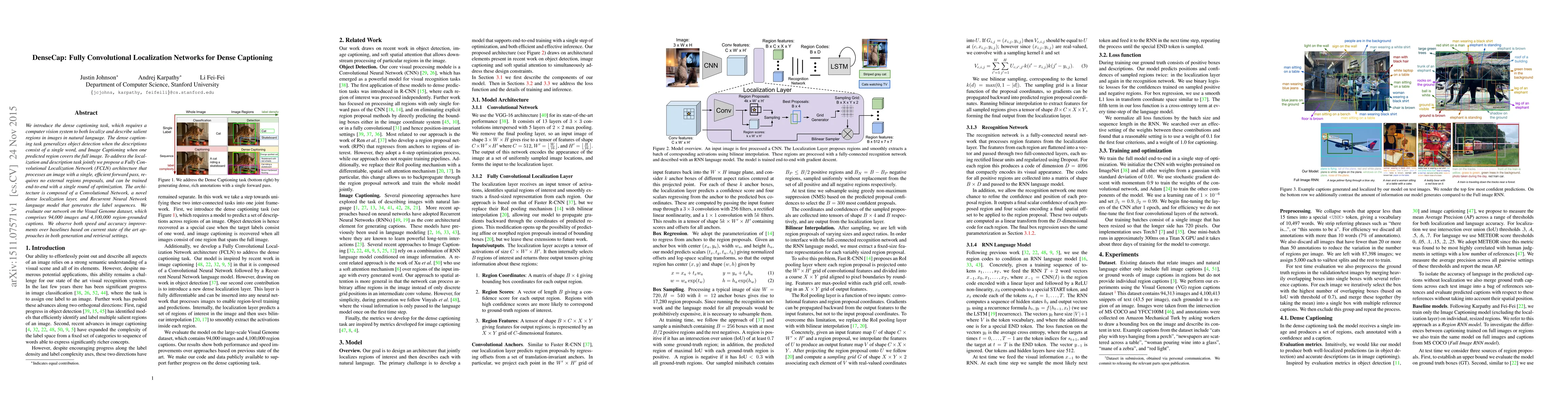 The paper proposes a Fully Convolutional Localization Network (FCLN) for dense captioning, which jointly localizes and describes salient regions in images using a single forward pass. The FCLN architecture shows improved speed and accuracy over baselines on the Visual Genome dataset.