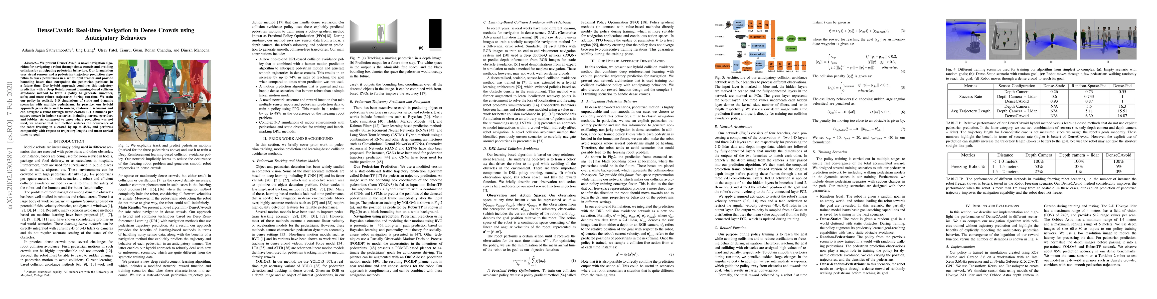 DenseCAvoid is a navigation algorithm that combines pedestrian trajectory prediction with Deep Reinforcement Learning to enable robots to navigate through dense crowds safely and efficiently. The method reduces robot freezing in crowds by up to 48% and performs well in both simulated and real-world scenarios.