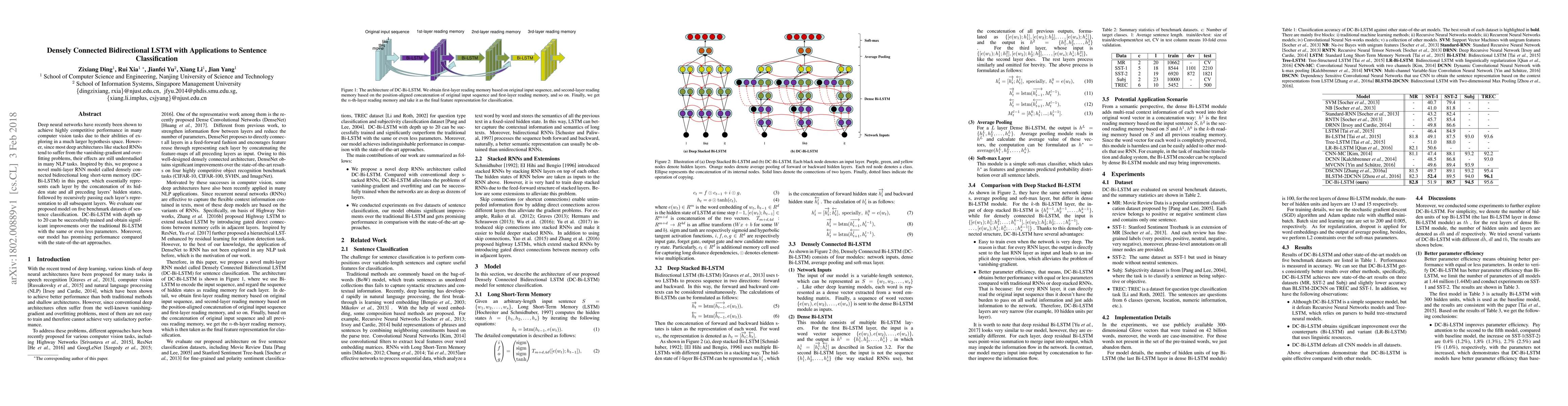 This paper proposes a densely connected bidirectional LSTM (DC-Bi-LSTM) model that concatenates hidden states across layers to mitigate vanishing gradients and overfitting, achieving superior results in sentence classification compared to traditional Bi-LSTM and state-of-the-art methods.