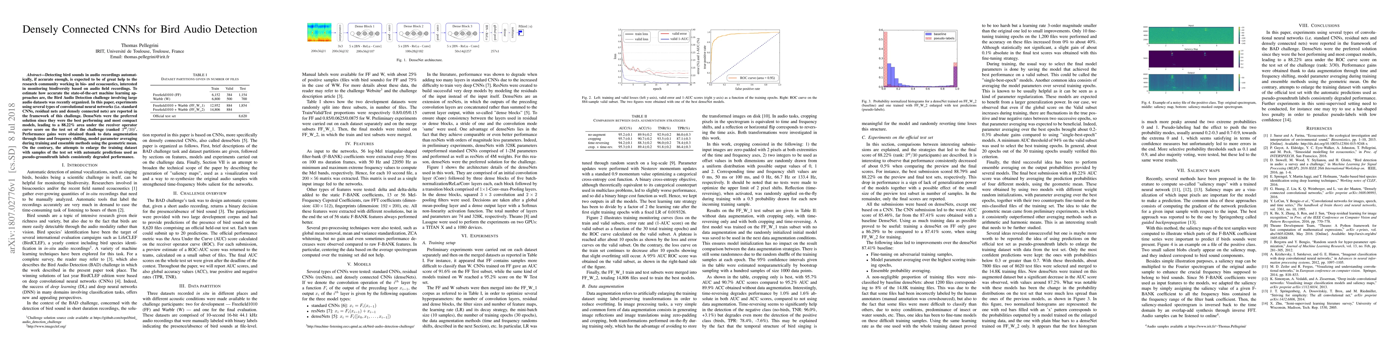 Detecting bird sounds in audio recordings automatically, if accurate enough, is expected to be of great help to the research community working in bio- and ecoacoustics, interested in monitoring biodiversity based on audio field recordings. To estimate how accurate the state-of-the-art machine learning approaches are, the Bird Audio Detection challenge involving large audio datasets was recently organized. In this paper, experiments using several types of convolutional neural networks (i.e. standard CNNs, residual nets and densely connected nets) are reported in the framework of this challenge. DenseNets were the preferred solution since they were the best performing and most compact models, leading to a 88.22% area under the receiver operator curve score on the test set of the challenge. Performance gains were obtained thank to data augmentation through time and frequency shifting, model parameter averaging during training and ensemble methods using the geometric mean. On the contrary, the attempts to enlarge the training dataset with samples of the test set with automatic predictions used as pseudo-groundtruth labels consistently degraded performance.