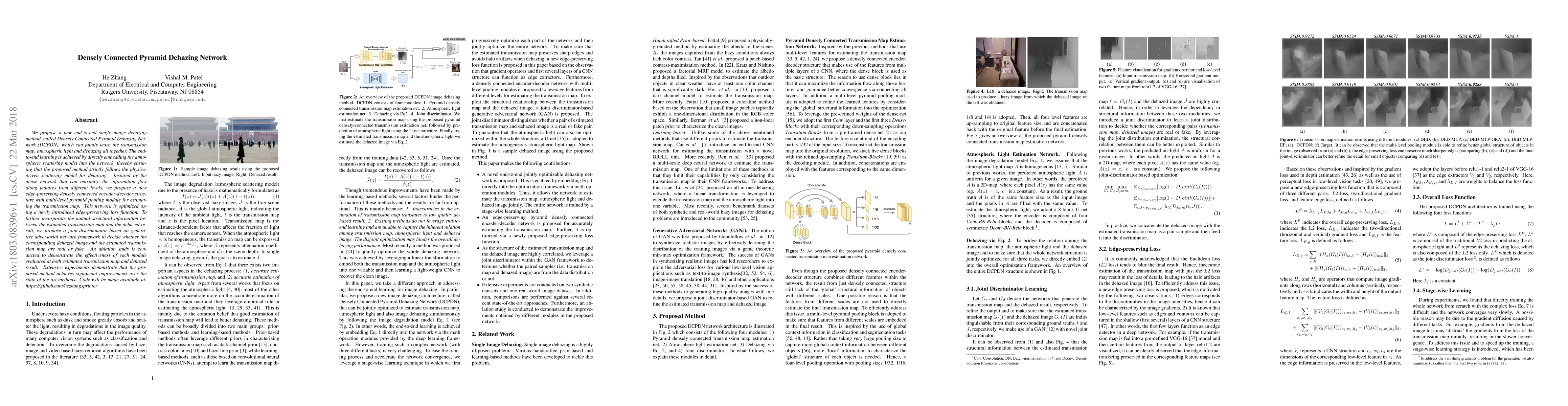 The Densely Connected Pyramid Dehazing Network (DCPDN) proposes an end-to-end method for single image dehazing that jointly learns the transmission map, atmospheric light, and dehazing using an embedded atmospheric scattering model. The network employs a densely connected encoder-decoder structure with a multi-level pyramid pooling module and an edge-preserving loss function, enhanced by a joint discriminator based on GANs for improved structural information.