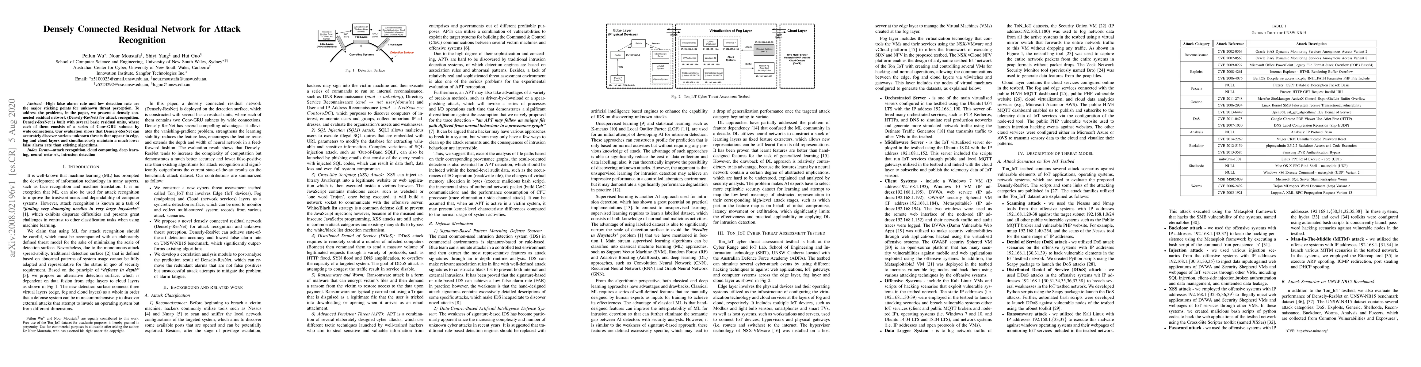 This paper introduces a densely connected residual network (Densely-ResNet) to improve attack recognition with lower false alarm rates and higher detection accuracy for unknown threats. The proposed network utilizes Conv-GRU subnets and wide connections to effectively identify various threats across edge, fog, and cloud layers.