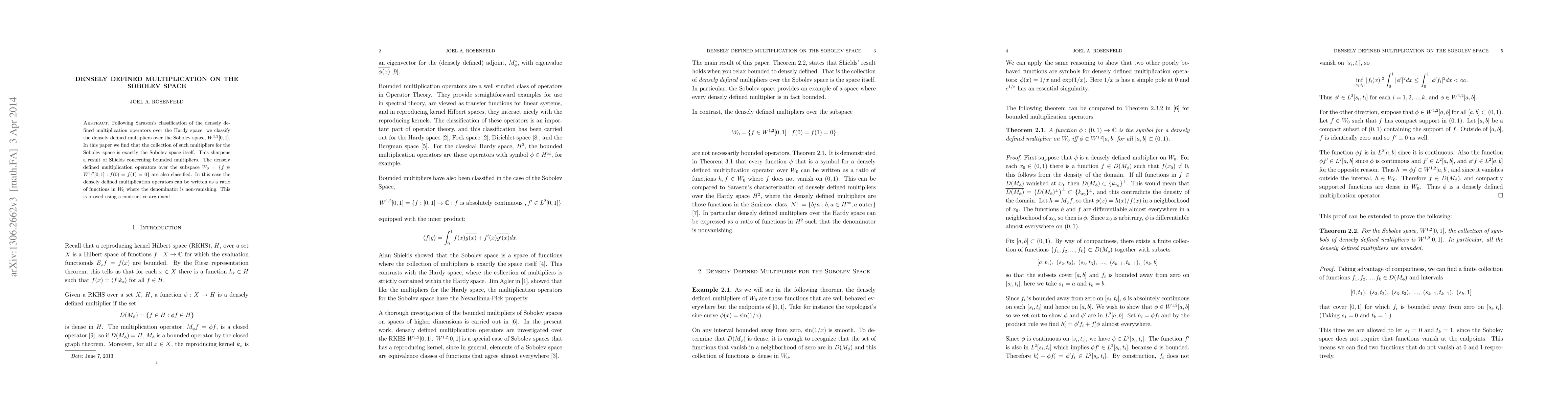 Following Sarason's classification of the densely defined multiplication operators over the Hardy space, we classify the densely defined multipliers over the Sobolev space, $W^{1,2}[0,1]$. In this paper we find that the collection of such multipliers for the Sobolev space is exactly the Sobolev space itself. This sharpens a result of Shields concerning bounded multipliers. The densely defined multiplication operators over the subspace $W_0 = \{f \in W^{1,2}[0,1] : f(0)=f(1)=0 \}$ are also classified. In this case the densely defined multiplication operators can be written as a ratio of functions in $W_0$ where the denominator is non-vanishing. This is proved using a contructive argument.
