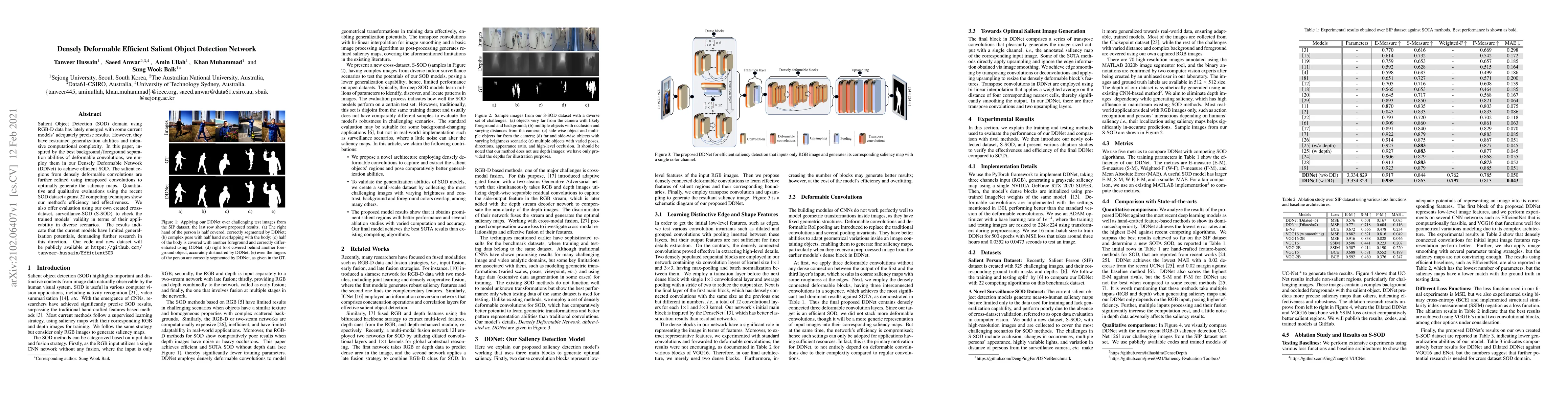 This paper proposes a Densely Deformable Network (DDNet) for efficient Salient Object Detection (SOD) using RGB-D data, leveraging deformable convolutions for improved background/foreground separation and transposed convolutions for refined salient region detection. Evaluations show DDNet's superior efficiency and effectiveness compared to 22 competing techniques, though generalization across diverse scenarios remains limited.