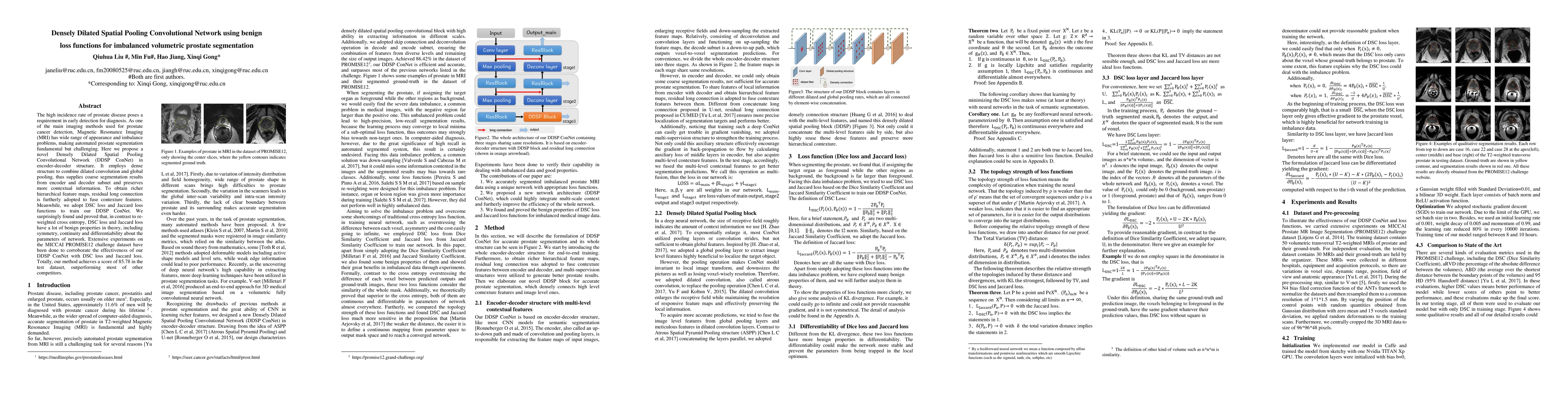 The high incidence rate of prostate disease poses a requirement in early detection for diagnosis. As one of the main imaging methods used for prostate cancer detection, Magnetic Resonance Imaging (MRI) has wide range of appearance and imbalance problems, making automated prostate segmentation fundamental but challenging. Here we propose a novel Densely Dilated Spatial Pooling Convolutional Network (DDSP ConNet) in encoder-decoder structure. It employs dense structure to combine dilated convolution and global pooling, thus supplies coarse segmentation results from encoder and decoder subnet and preserves more contextual information. To obtain richer hierarchical feature maps, residual long connection is furtherly adopted to fuse contexture features. Meanwhile, we adopt DSC loss and Jaccard loss functions to train our DDSP ConNet. We surprisingly found and proved that, in contrast to re-weighted cross entropy, DSC loss and Jaccard loss have a lot of benign properties in theory, including symmetry, continuity and differentiability about the parameters of network. Extensive experiments on the MICCAI PROMISE12 challenge dataset have been done to corroborate the effectiveness of our DDSP ConNet with DSC loss and Jaccard loss. Totally, our method achieves a score of 85.78 in the test dataset, outperforming most of other competitors.