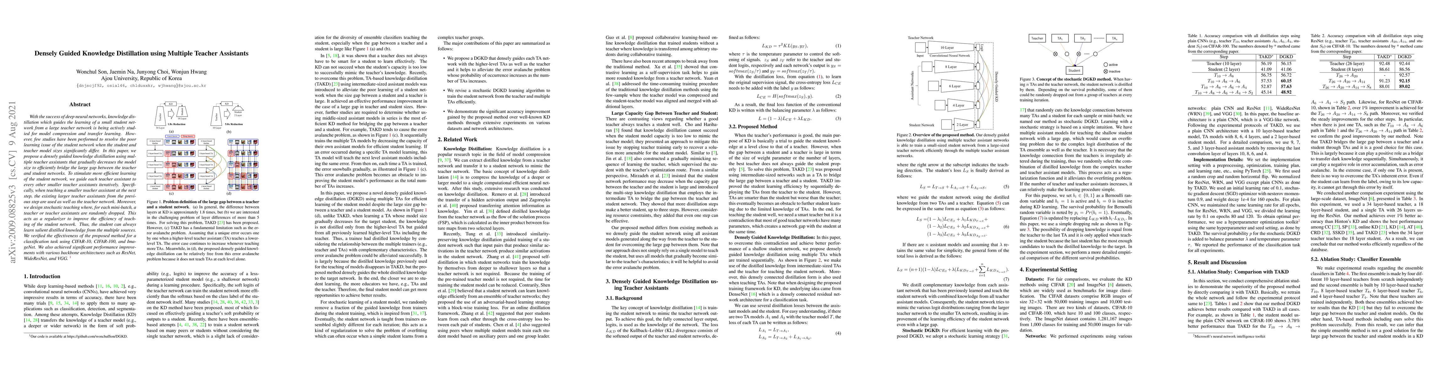 This paper proposes a densely guided knowledge distillation method using multiple teacher assistants to bridge the size gap between teacher and student networks, achieving efficient model compression and transfer learning. The method employs iterative guidance and stochastic teaching to enhance student network learning, demonstrated through improved performance on CIFAR-10, CIFAR-100, and ImageNet datasets using various backbone architectures.