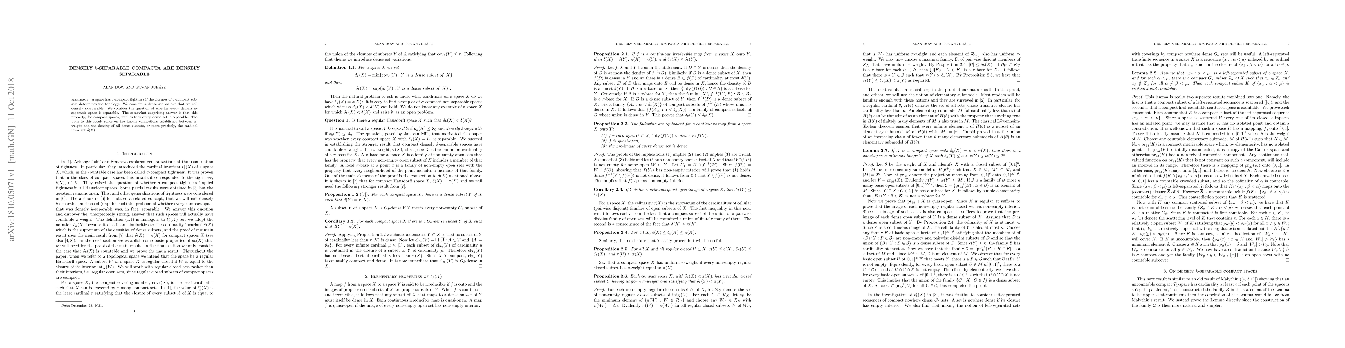 This paper demonstrates that compact spaces with densely k-separable properties are actually separable, relying on the relationship between $\pi$-weight and the density of dense subsets. The result is surprising as it shows that dense sets in such spaces are separable.