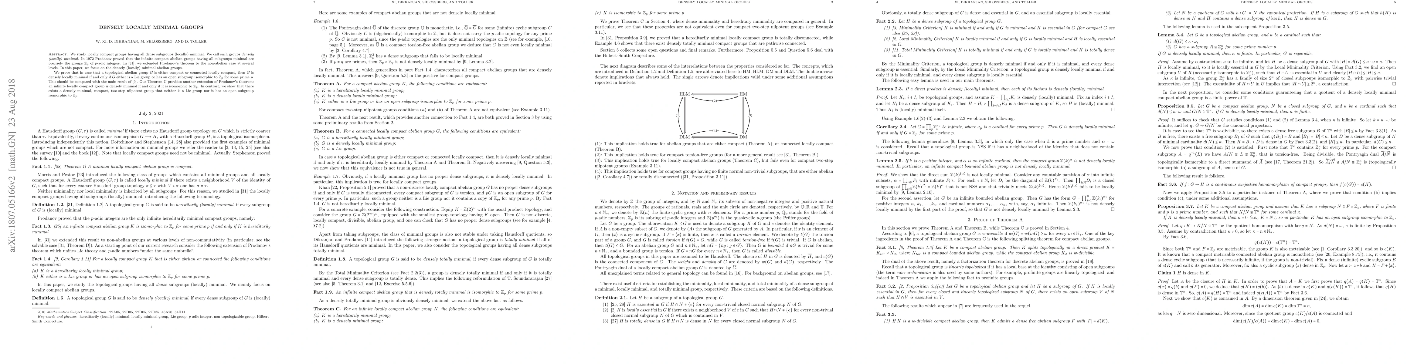 This paper studies densely (locally) minimal abelian groups, proving that such groups are either Lie groups or contain an open subgroup isomorphic to $\mathbb Z_p$ for some prime $p$. Additionally, it presents a counterexample showing that not all densely minimal, compact, two-step nilpotent groups fit this classification.