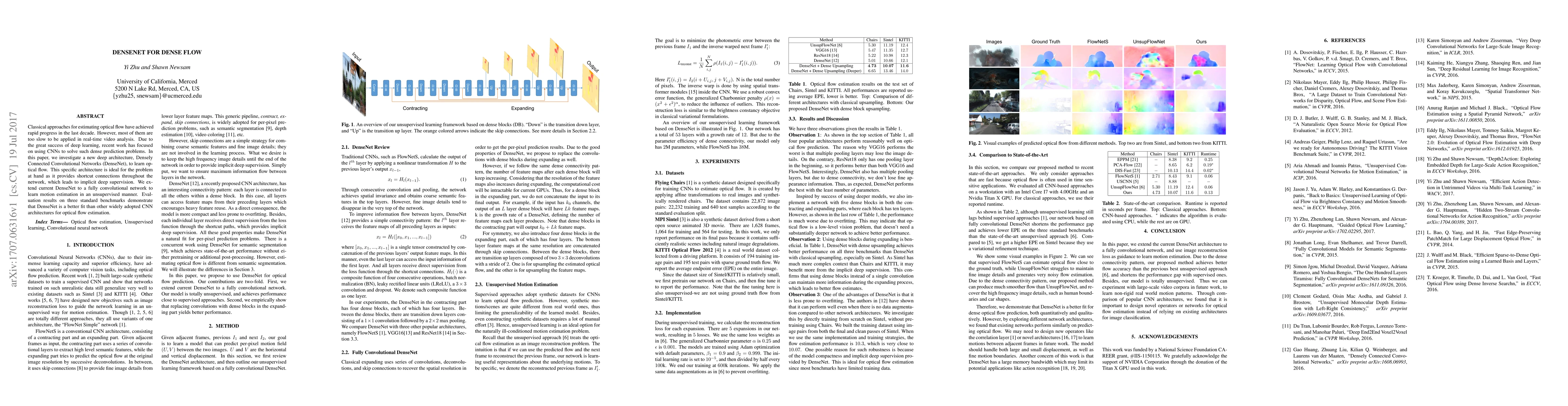 The paper proposes using Densely Connected Convolutional Networks (DenseNet) for estimating optical flow, offering a faster alternative to classical methods. Results on standard benchmarks show DenseNet outperforms other CNN architectures in unsupervised motion estimation.