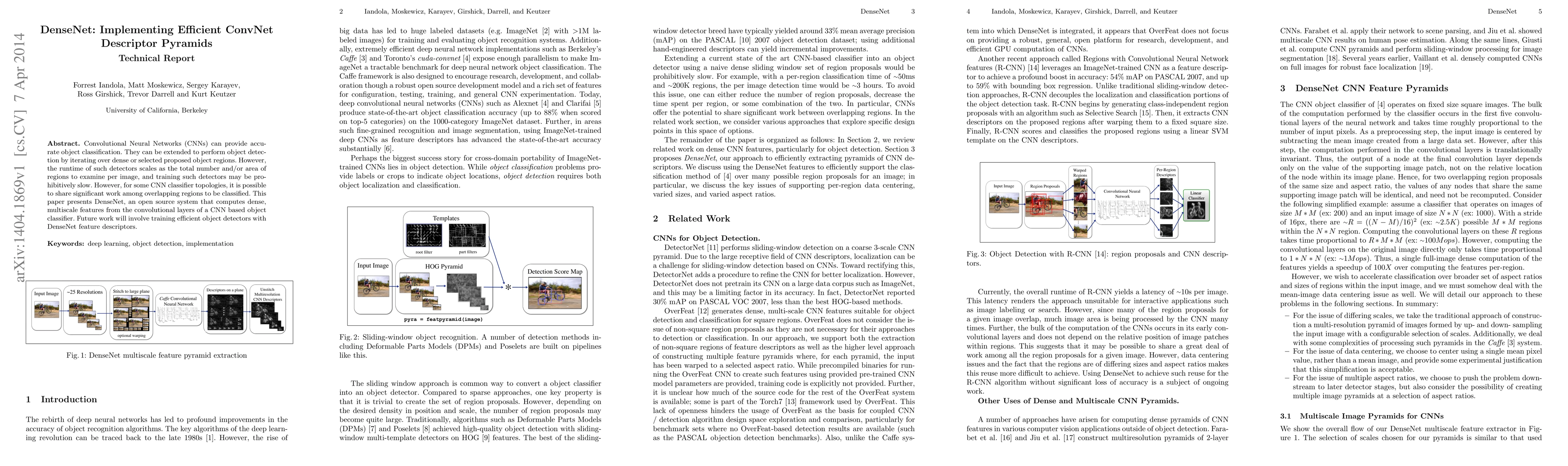 Convolutional Neural Networks (CNNs) can provide accurate object classification. They can be extended to perform object detection by iterating over dense or selected proposed object regions. However, the runtime of such detectors scales as the total number and/or area of regions to examine per image, and training such detectors may be prohibitively slow. However, for some CNN classifier topologies, it is possible to share significant work among overlapping regions to be classified. This paper presents DenseNet, an open source system that computes dense, multiscale features from the convolutional layers of a CNN based object classifier. Future work will involve training efficient object detectors with DenseNet feature descriptors.