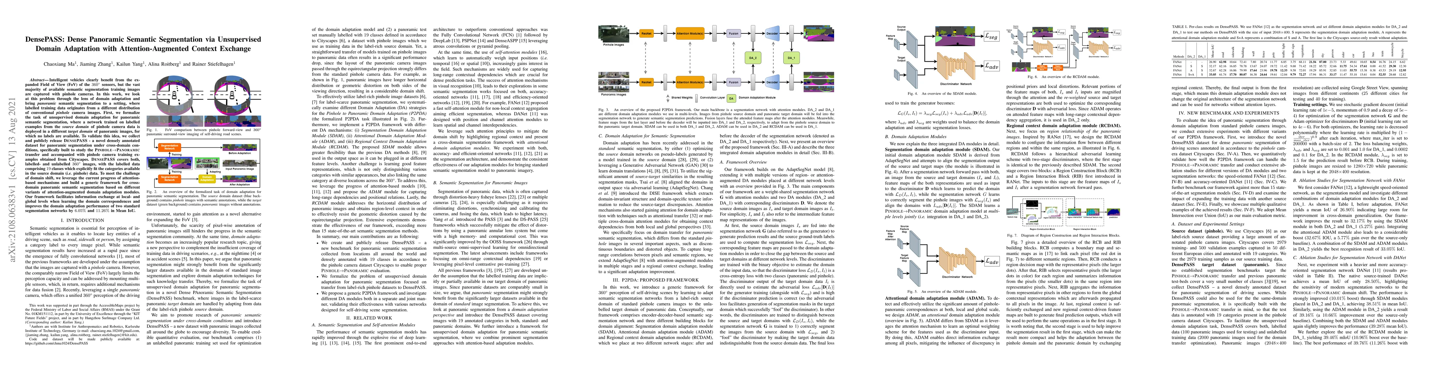 DensePASS introduces a framework for unsupervised domain adaptation to enable panoramic semantic segmentation from pinhole camera training data. The study presents a novel dataset, DensePASS, and employs attention-augmented context exchange to improve domain adaptation performance, achieving significant Mean IoU improvements.
