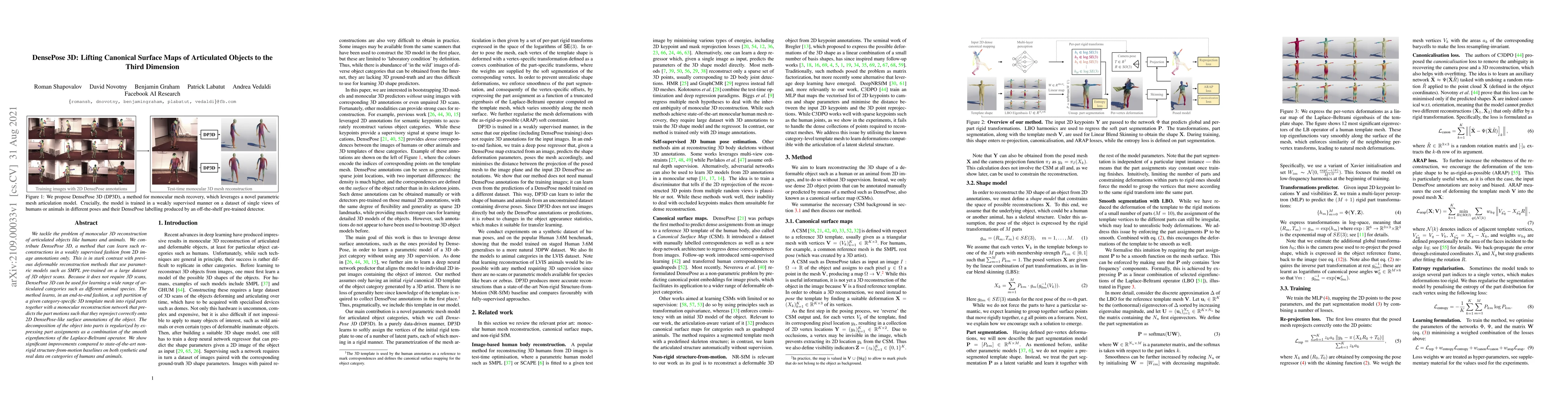 DensePose 3D presents a novel method for weakly supervised monocular 3D reconstruction of articulated objects from 2D image annotations, achieving significant improvements over existing non-rigid structure-from-motion techniques on both synthetic and real data. Unlike previous methods, it does not require 3D scans, enabling the reconstruction of diverse articulated categories.