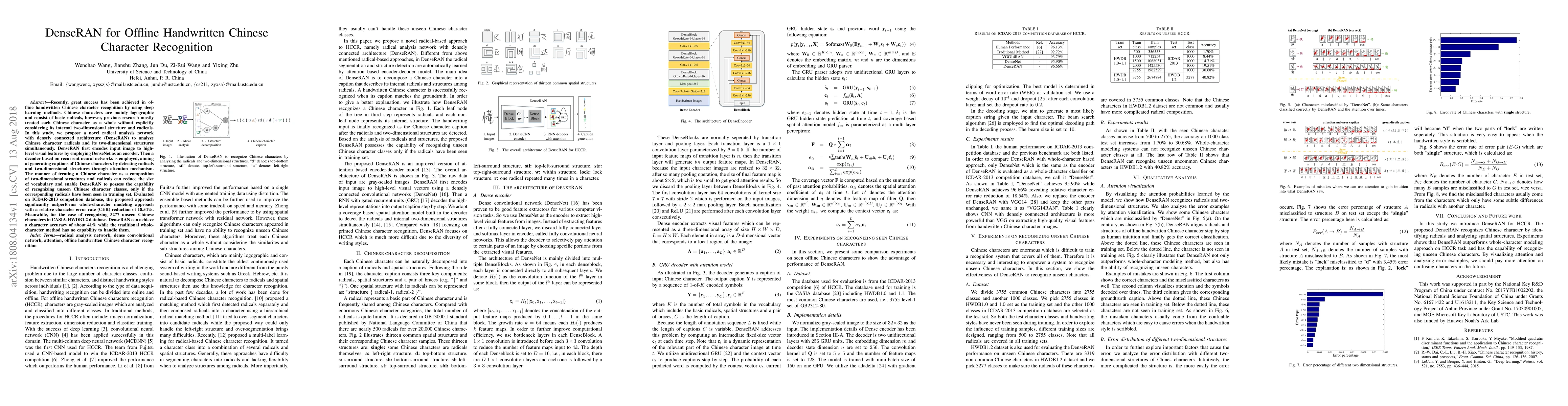 The paper introduces DenseRAN, a radical analysis network with densely connected architecture, for offline handwritten Chinese character recognition. DenseRAN encodes images into high-level features using DenseNet and employs a recurrent neural network decoder with attention to detect radicals and structures, improving recognition of both seen and unseen characters.