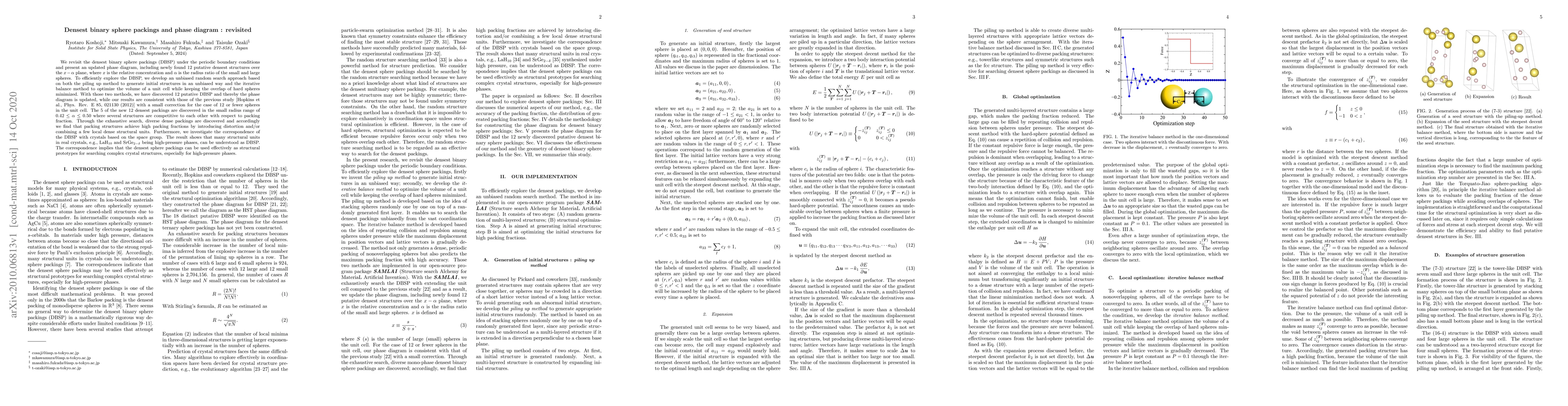 This paper revisits densest binary sphere packings (DBSP) under periodic boundary conditions, presenting an updated phase diagram with 12 newly found putative densest structures. The authors developed an unbiased random search approach to discover these structures, which are consistent with previous findings but correct a small error for cases with 12 or fewer spheres. The study also highlights the correspondence of DBSP with real crystal structures, suggesting their use as prototypes for high-pressure phases.