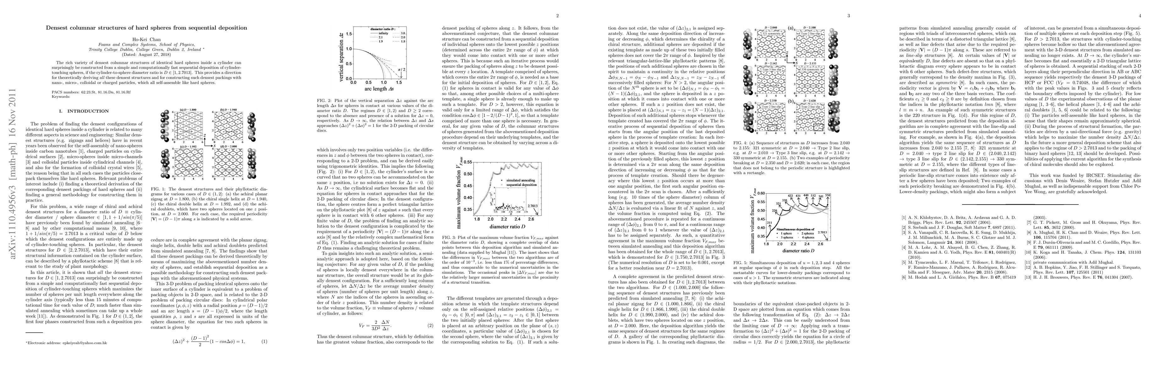 The research utilizes a sequential deposition method of hard spheres in a cylinder, showing that densest columnar structures can be constructed if the cylinder-to-sphere diameter ratio (D) is within [1,2.7013].