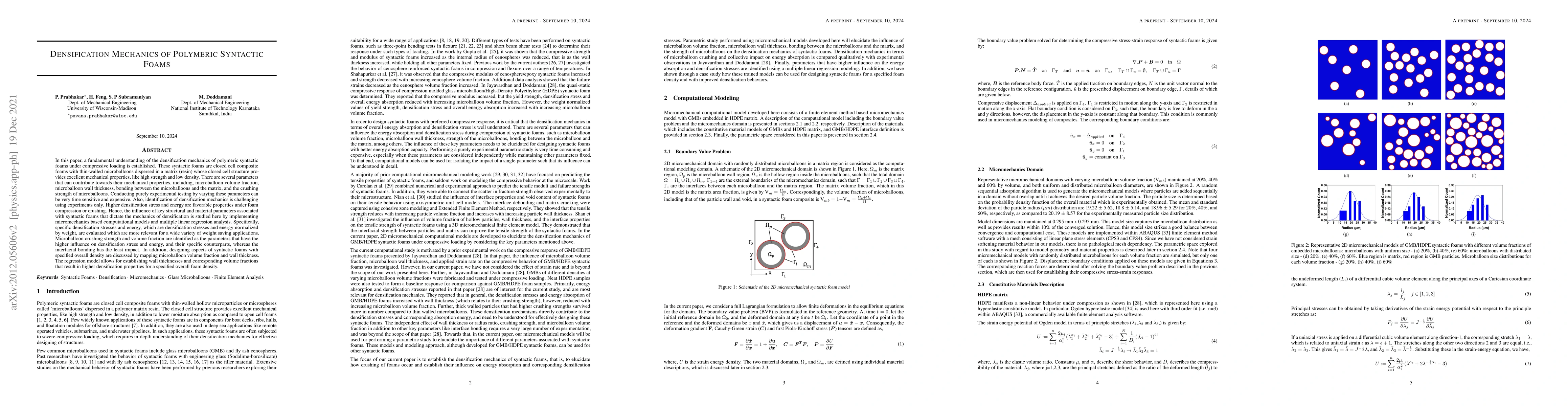 This paper investigates the densification mechanics of polymeric syntactic foams under compressive loading using micromechanics-based computational models and multiple linear regression analysis. Key parameters like microballoon volume fraction and crushing strength significantly influence densification stress and energy, while interfacial bonding has minimal impact.