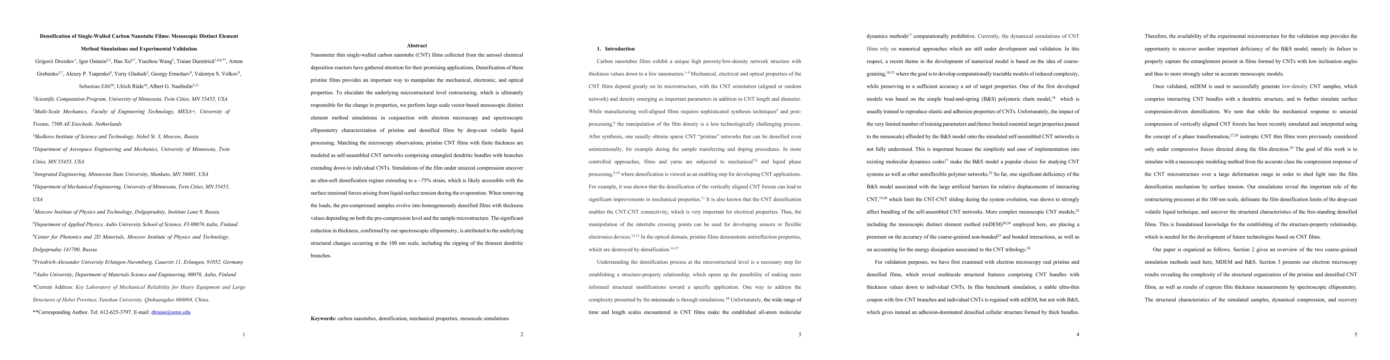 This paper investigates the densification of single-walled carbon nanotube films through mesoscopic simulations and experimental validation. The simulations reveal an ultra-soft densification regime under uniaxial compression, leading to significant thickness reduction via microstructural changes, confirmed by spectroscopic ellipsometry and microscopy.