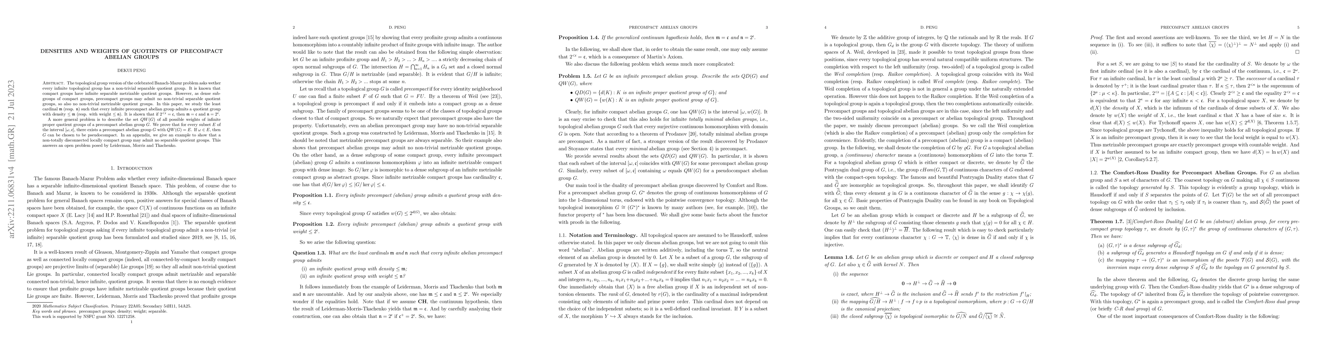 This paper investigates the densities and weights of quotients of precompact abelian groups, focusing on the least cardinals $\mathfrak{m}$ and $\mathfrak{n}$ such that every infinite precompact abelian group has a quotient with density $\leq \mathfrak{m}$ and weight $\leq \mathfrak{n}$. It demonstrates that under the condition $2^{<\mathfrak{c}}=\mathfrak{c}$, $\mathfrak{m}=\mathfrak{c}$ and $\mathfrak{n}=2^\mathfrak{c}$. The paper also proves the existence of precompact abelian groups with any specified set of quotient weights within a given interval.