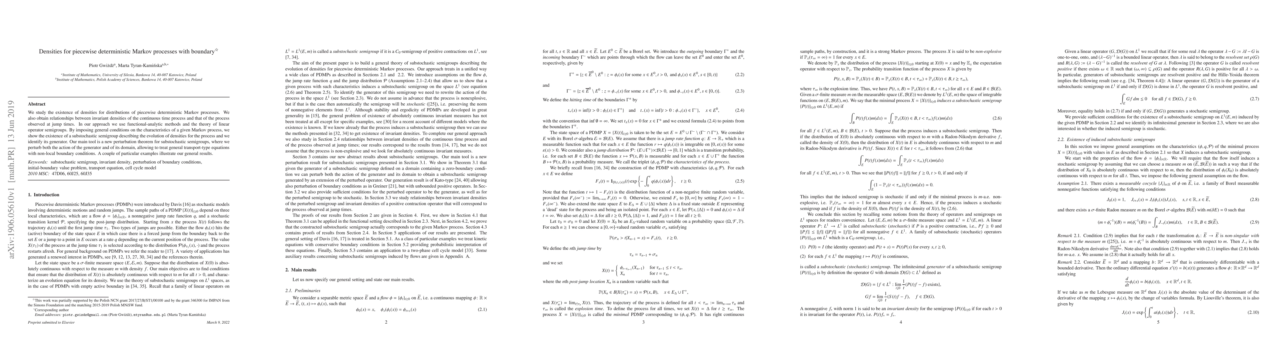 We study the existence of densities for distributions of piecewise deterministic Markov processes. We also obtain relationships between invariant densities of the continuous time process and that of the process observed at jump times. In our approach we use functional-analytic methods and the theory of linear operator semigroups. By imposing general conditions on the characteristics of a given Markov process, we show the existence of a substochastic semigroup describing the evolution of densities for the process and we identify its generator. Our main tool is a new perturbation theorem for substochastic semigroups, where we perturb both the action of the generator and of its domain, allowing to treat general transport-type equations with non-local boundary conditions. A couple of particular examples illustrate our general results.