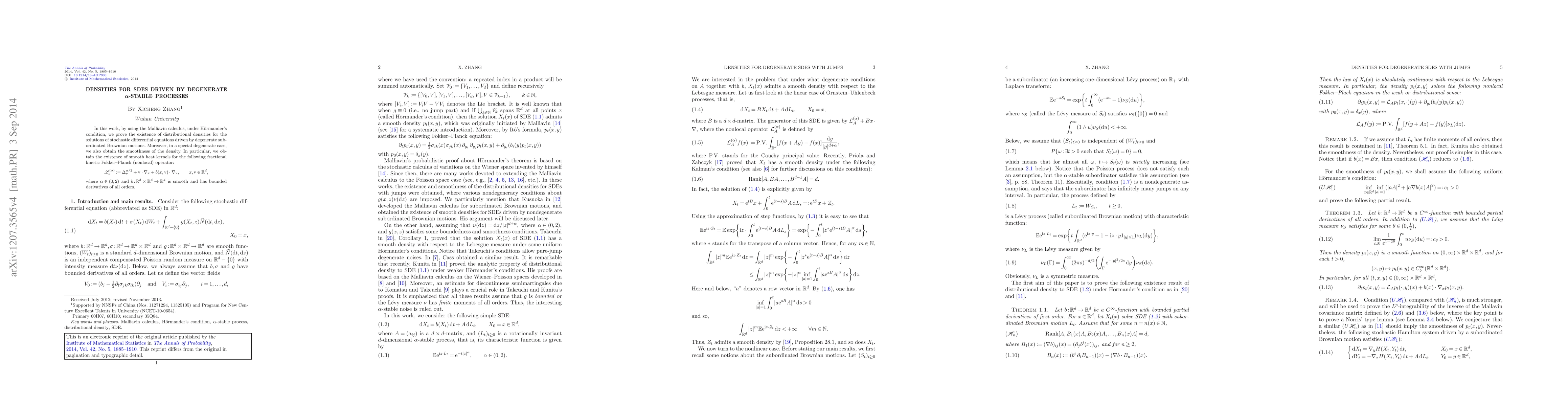 In this work, by using the Malliavin calculus, under H\"ormander's condition, we prove the existence of distributional densities for the solutions of stochastic differential equations driven by degenerate subordinated Brownian motions. Moreover, in a special degenerate case, we also obtain the smoothness of the density. In particular, we obtain the existence of smooth heat kernels for the following fractional kinetic Fokker-Planck (nonlocal) operator: \[\mathscr{L}^{(\alpha)}_b:=\Delta^{\alpha/2}_{\mathrm{v}}+\mathrm {v}\cdot \nabla_x+b(x,\mathrm{v})\cdot \nabla_{\mathrm{v}},\qquad x,\mathrm{v}\in\mathbb{R}^d,\] where $\alpha\in(0,2)$ and $b:\mathbb{R}^d\times\mathbb{R}^d\to \mathbb{R}^d$ is smooth and has bounded derivatives of all orders.