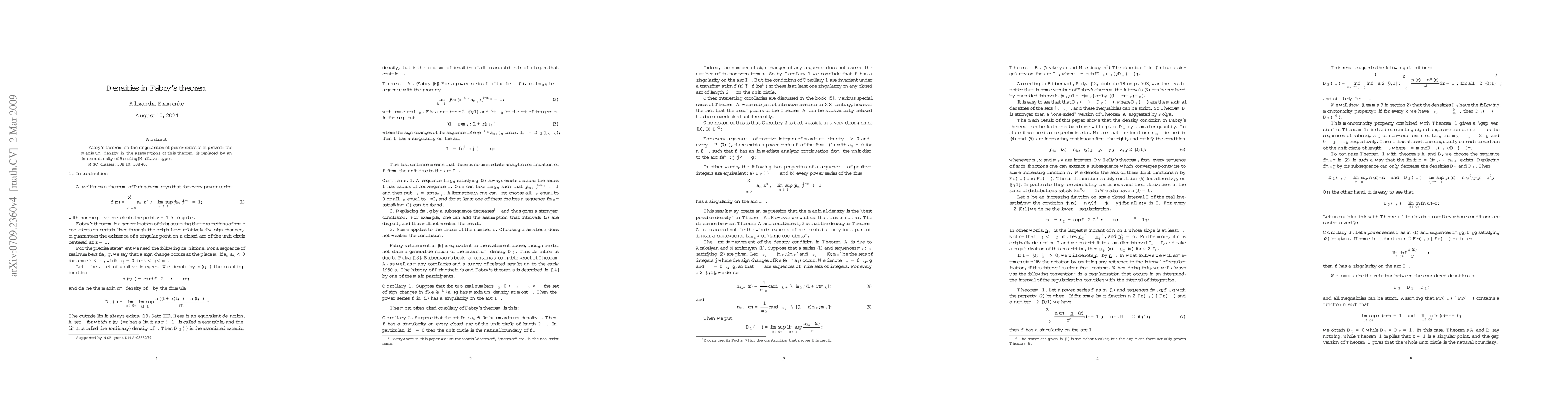 This research enhances Fabry's theorem on power series singularities by substituting the maximum density assumption with a Beurling--Malliavin type interior density.