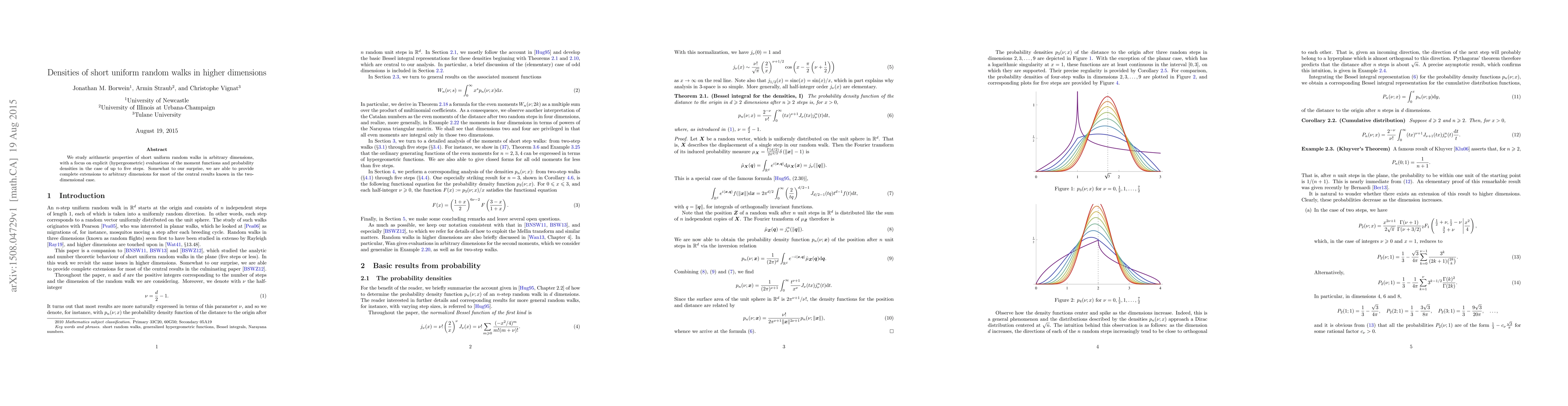 This paper explores the arithmetic properties of short uniform random walks in higher dimensions, providing explicit hypergeometric evaluations of moment functions and probability densities for up to five steps. It extends most central two-dimensional results to arbitrary dimensions.