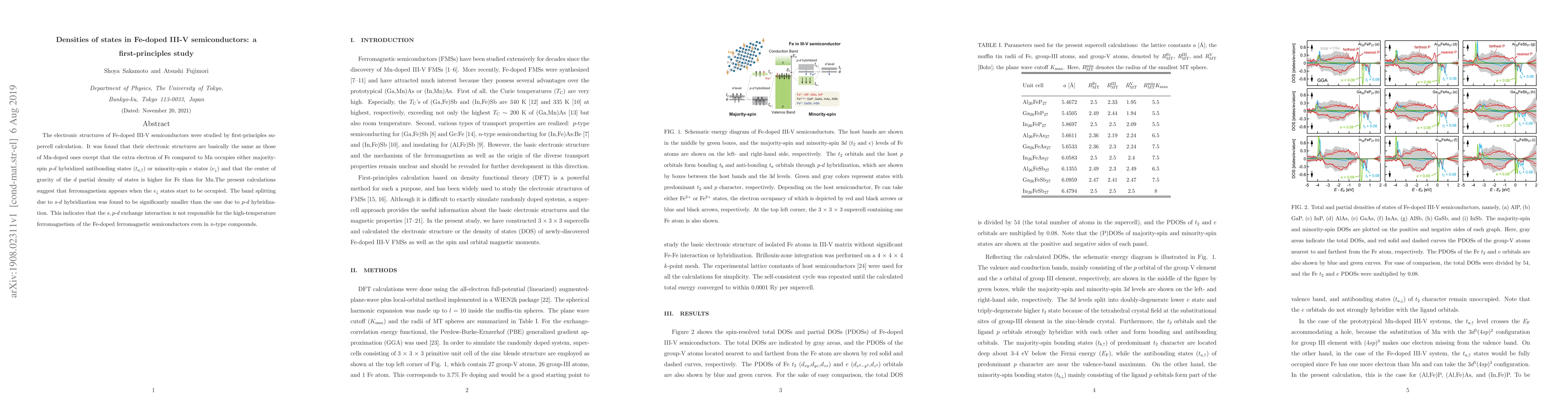 This study uses first-principles calculations to analyze Fe-doped III-V semiconductors, finding that Fe's extra electron occupies $t_{a,\uparrow}$ or $e_{\downarrow}$ states, leading to higher $d$ partial density of states and suggesting ferromagnetism when $e_{\downarrow}$ states are occupied. The $s$-$d$ hybridization's band splitting is much smaller than $p$-$d$ hybridization, indicating it is not responsible for high-temperature ferromagnetism.