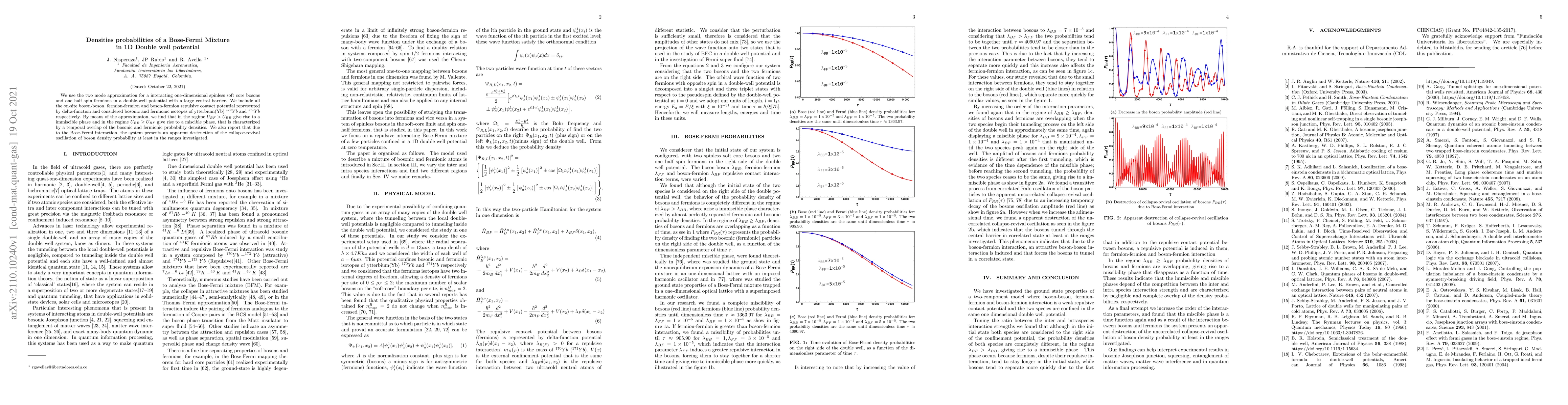 We use the two mode approximation for a interacting one-dimensional spinless soft core bosons and one half spin fermions in a double-well potential with a large central barrier. We include all the on-site boson-boson, fermion-fermion and boson-fermion repulsive contact potential represented by delta-function and considered bosonic and fermionic isotopes of ytterbium(Yb) $^{170}Yb$ and $^{171}Yb$ respectively. By means of the approximation, we find that in the regime $U_{BF}>U_{BB}$ give rise to a immiscible phase and in the regime $U_{BB}\geq U_{BF}$ give rise to a miscible phase, that is characterized by a temporal overlap of the bosonic and fermionic probability densities. We also report that due to the Bose-Fermi interaction, the system presents an apparent destruction of the collapse-revival oscillation of boson density probability at least in the ranges investigated.